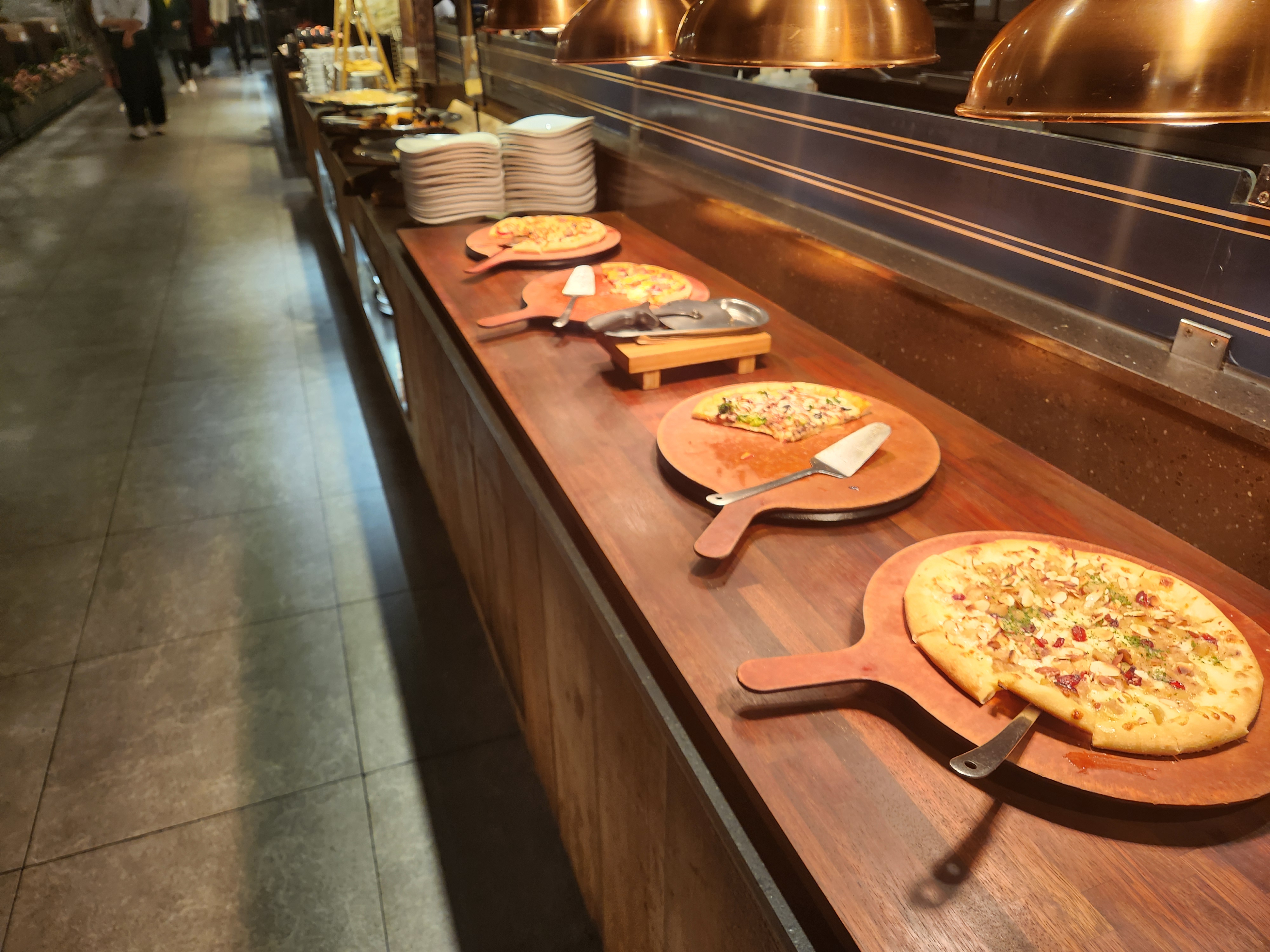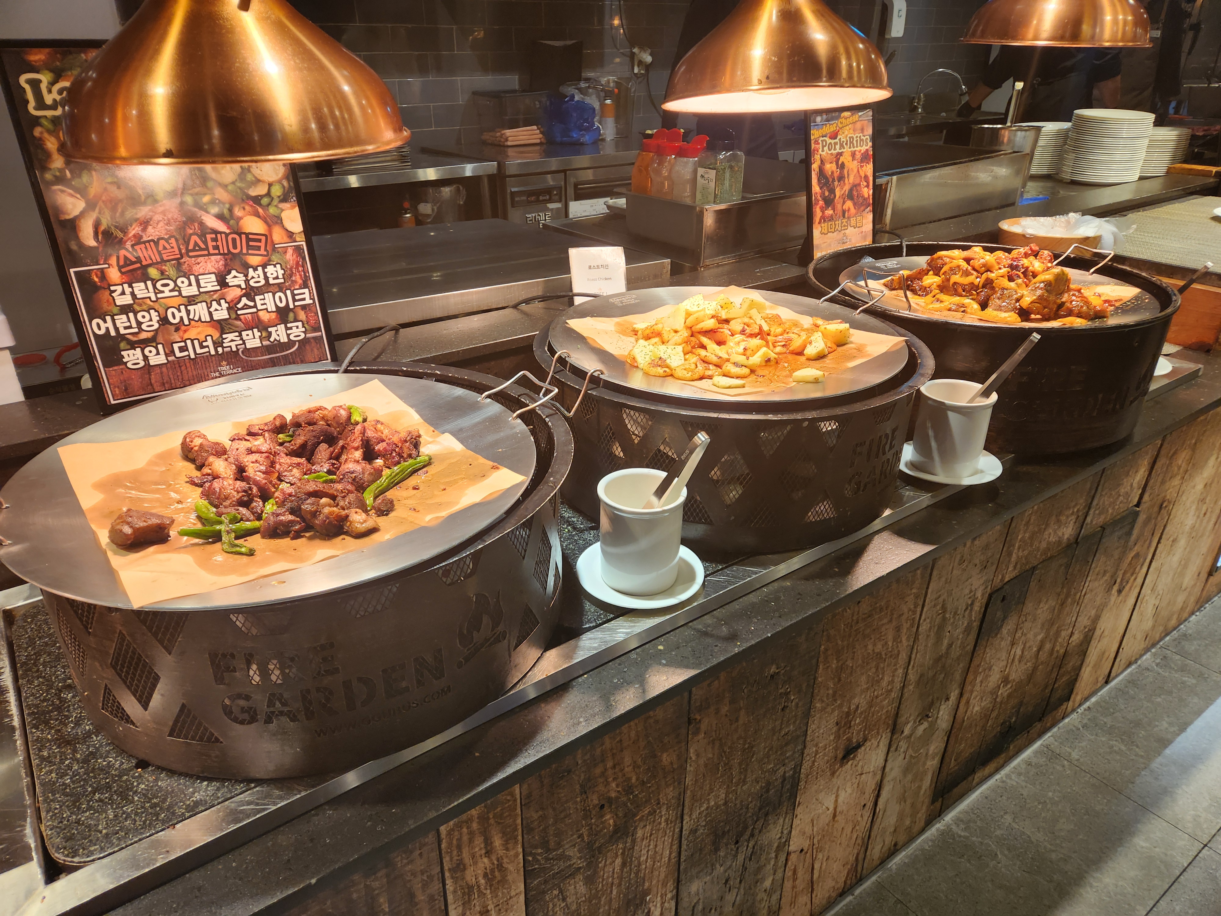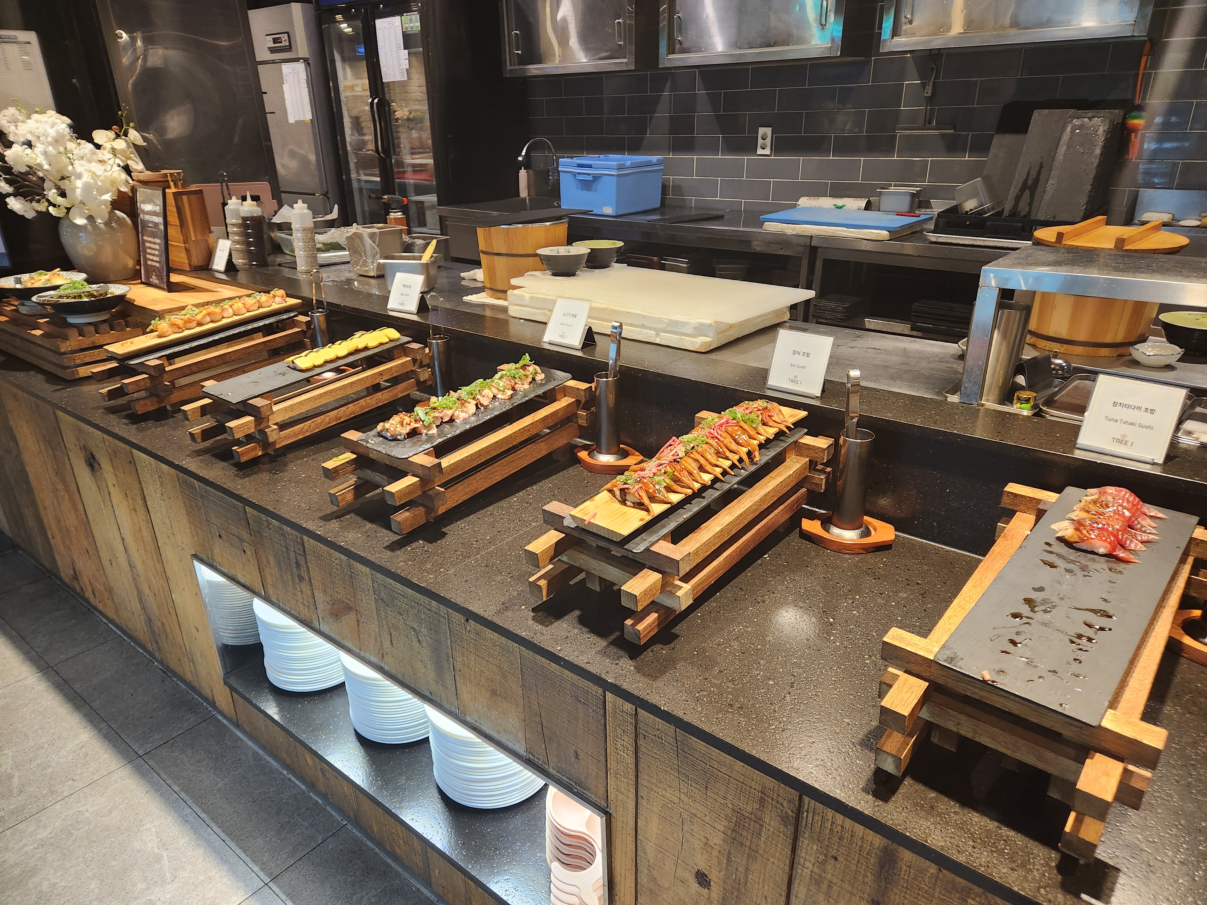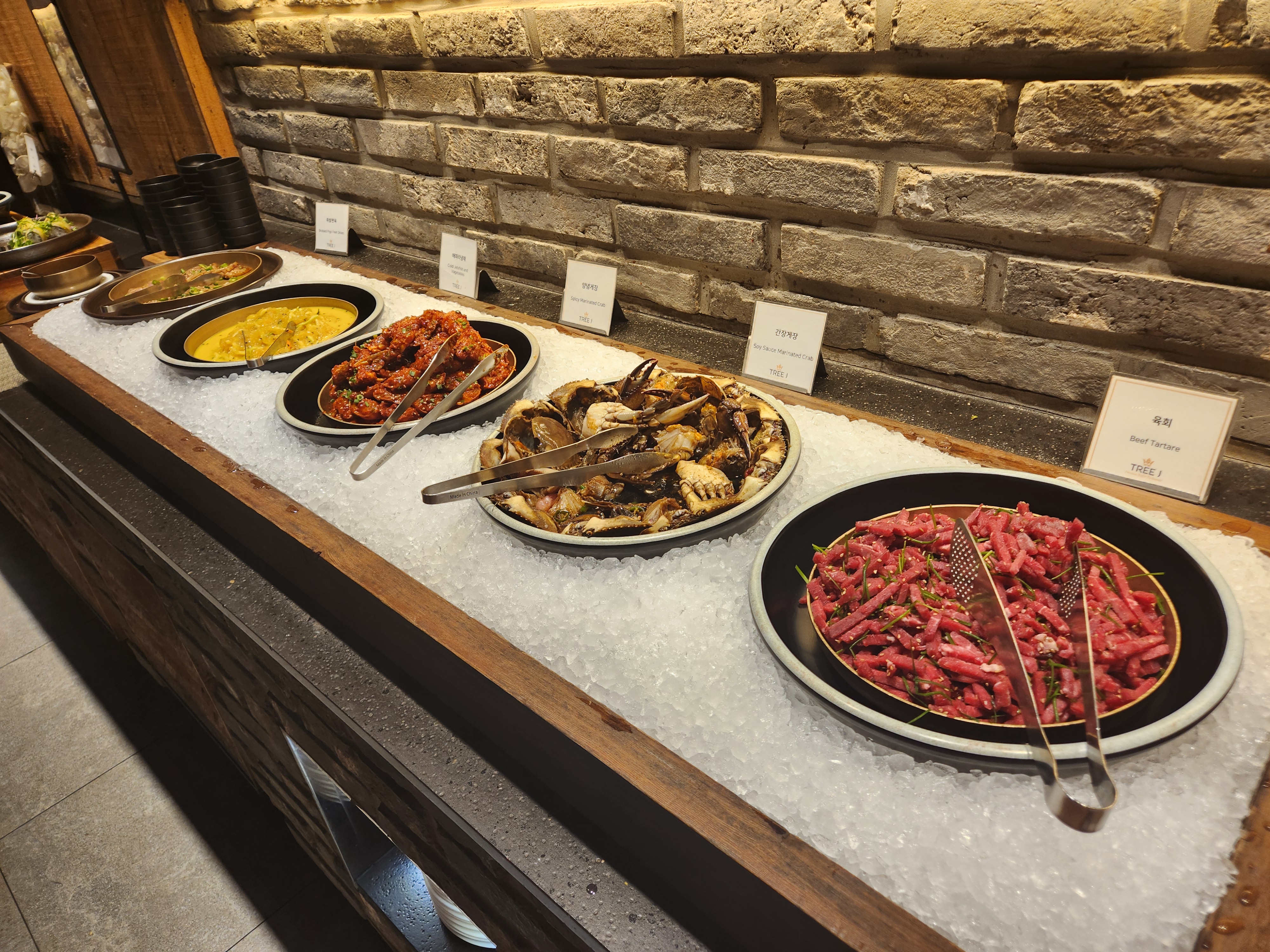 음식들은 또한 대체로 맛있었다! 회와 초밥들도 식감이 좋았고 피자, 게장들도 맛있었고 특히 스테이크도 맛있었다! 스테이크는 기다리면 즉석에서 만들어주는데 역시 나이프로 잘라먹는 맛이 있었다! 다만 힘줄은 피해서 고르는 게 좋다~