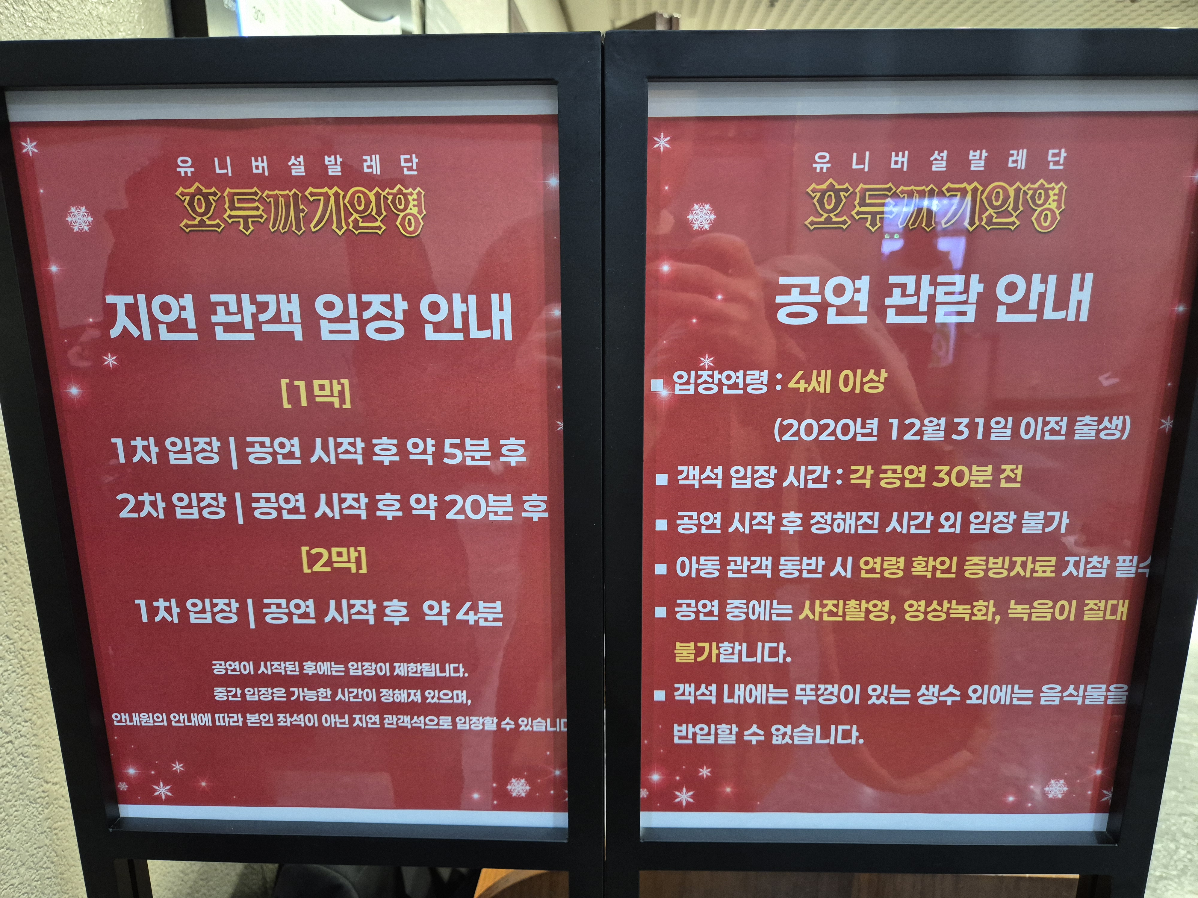 솔직히 대사나 노래가 있는 공연만 보다가 음악 속의 발레 공연을 보니 지루한 감은 있었다! 그래도 발레나 무용을 좋아하는 사람은 재밌게 볼 수 있을 것 같다~ 가성비는 좋지만 필자는 재관람은 고민해 볼 듯..