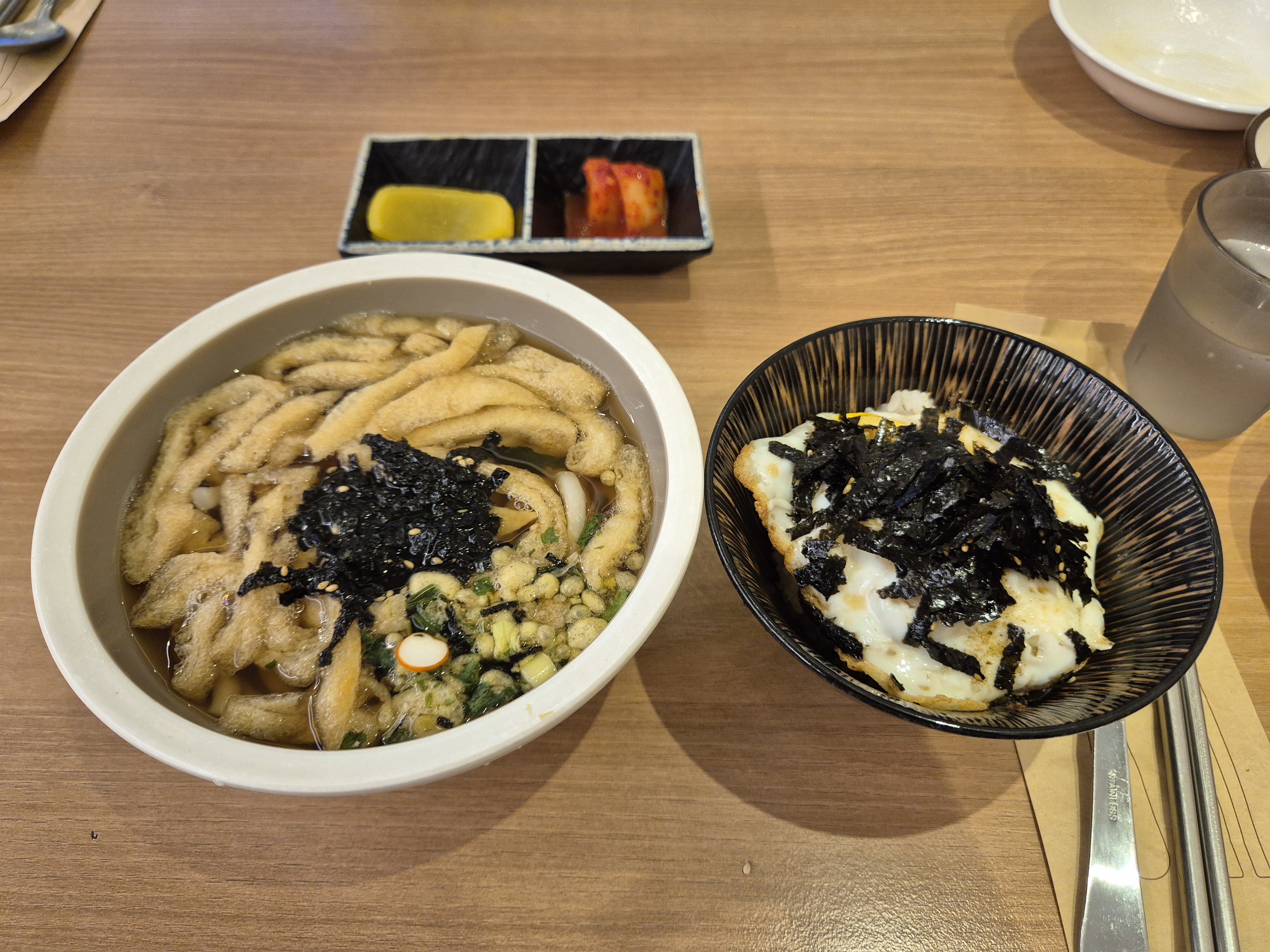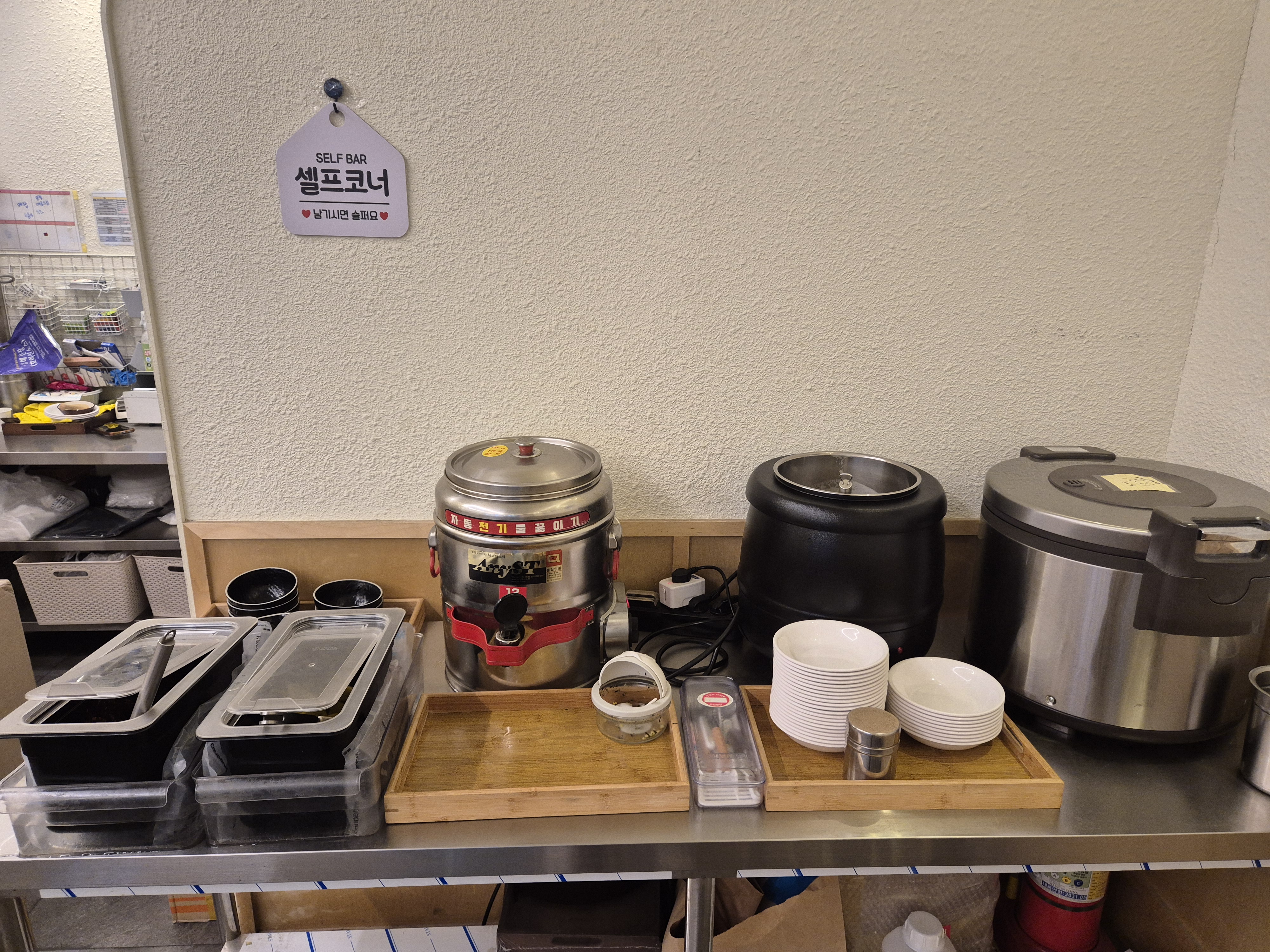 셀프 코너는 작지만 구성이 잘되어있다. 단무지와 김치, 가락국수 국물, 수프, 밥을 먹을 수 있으며 원하는 만큼 가져가면 된다!