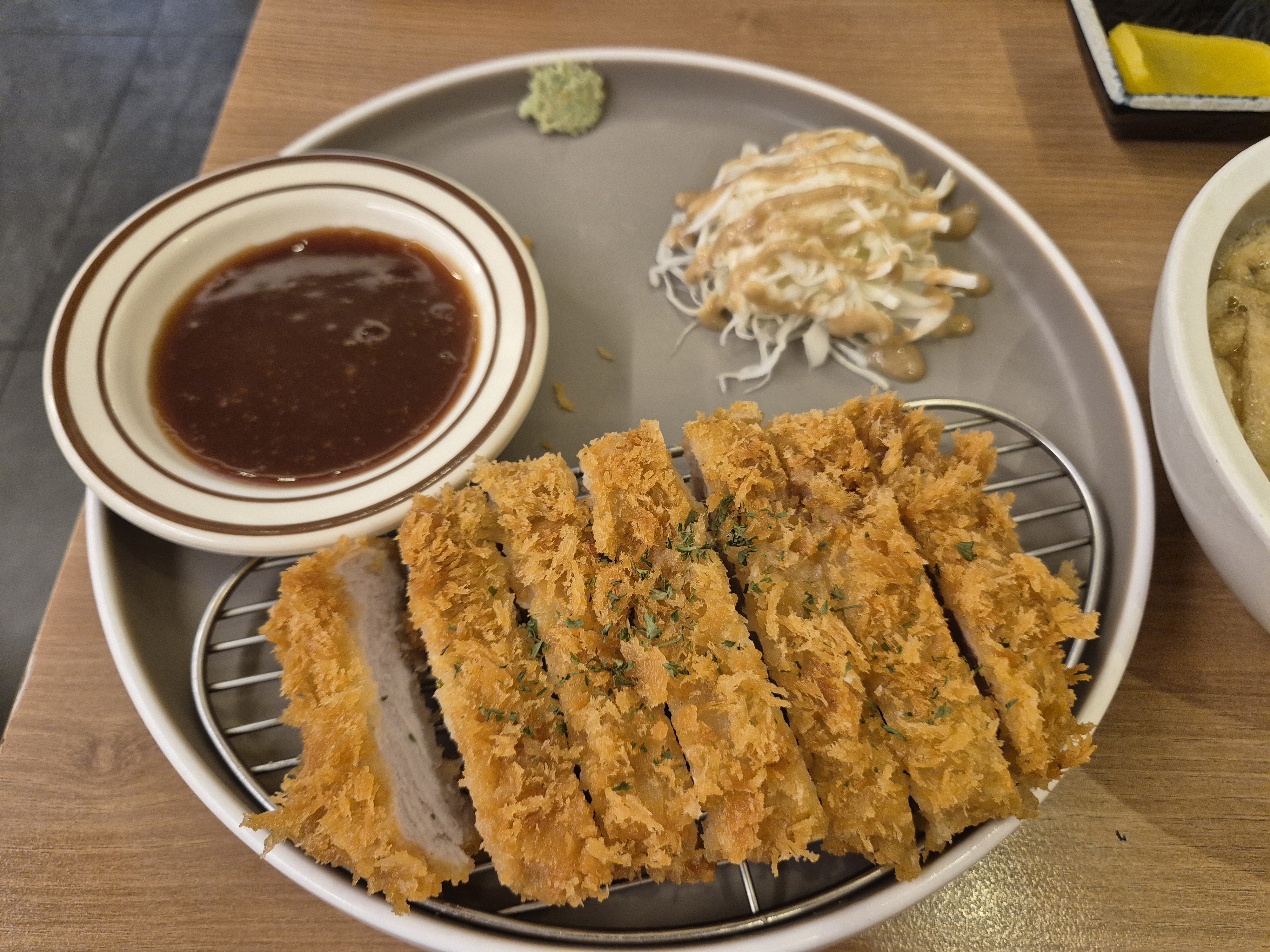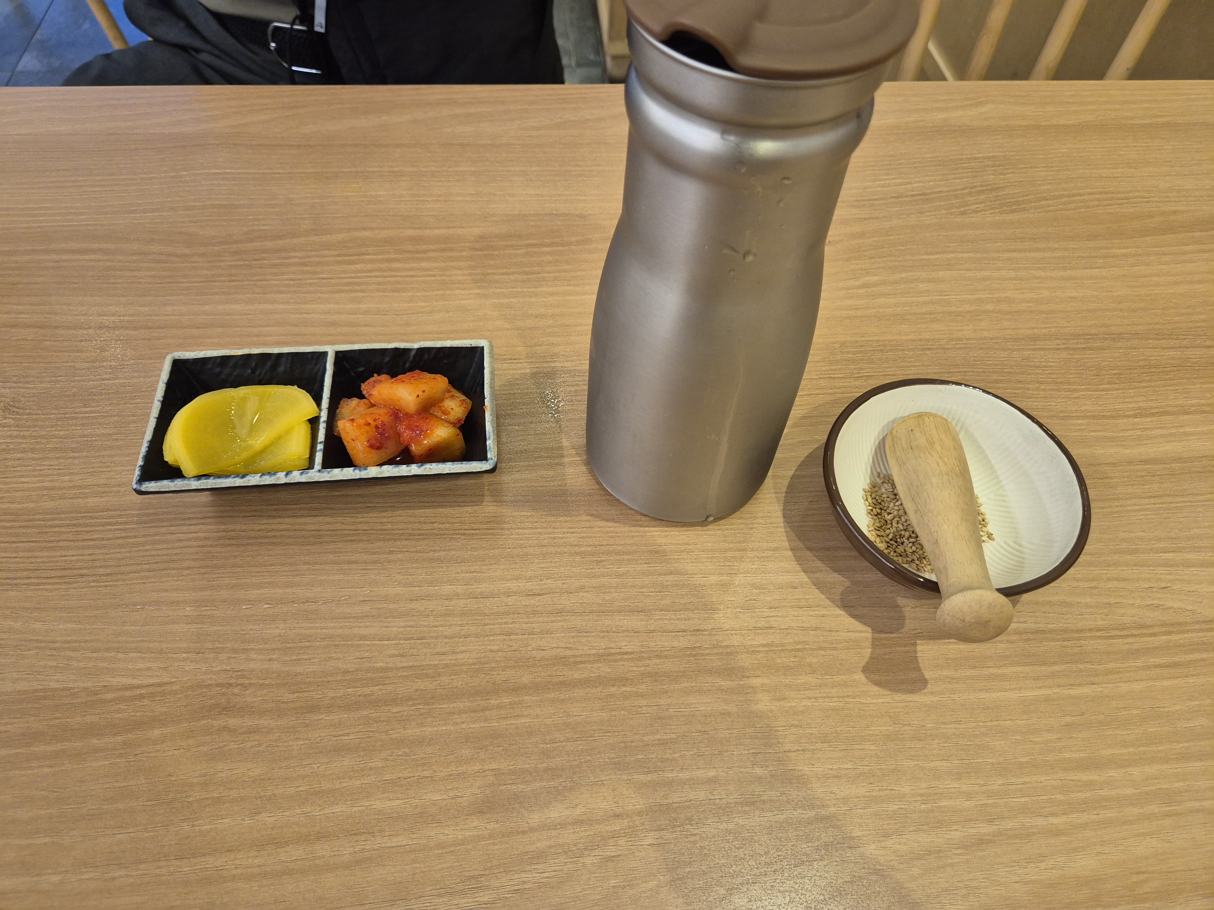 기본 세팅은 단무지와 깍두기가 제공되며 물도 같이 주신다! 참깨를 전용 그릇에 담아서 으깬 후 돈가스 소스에 얹어먹으면 맛있다고 한다~