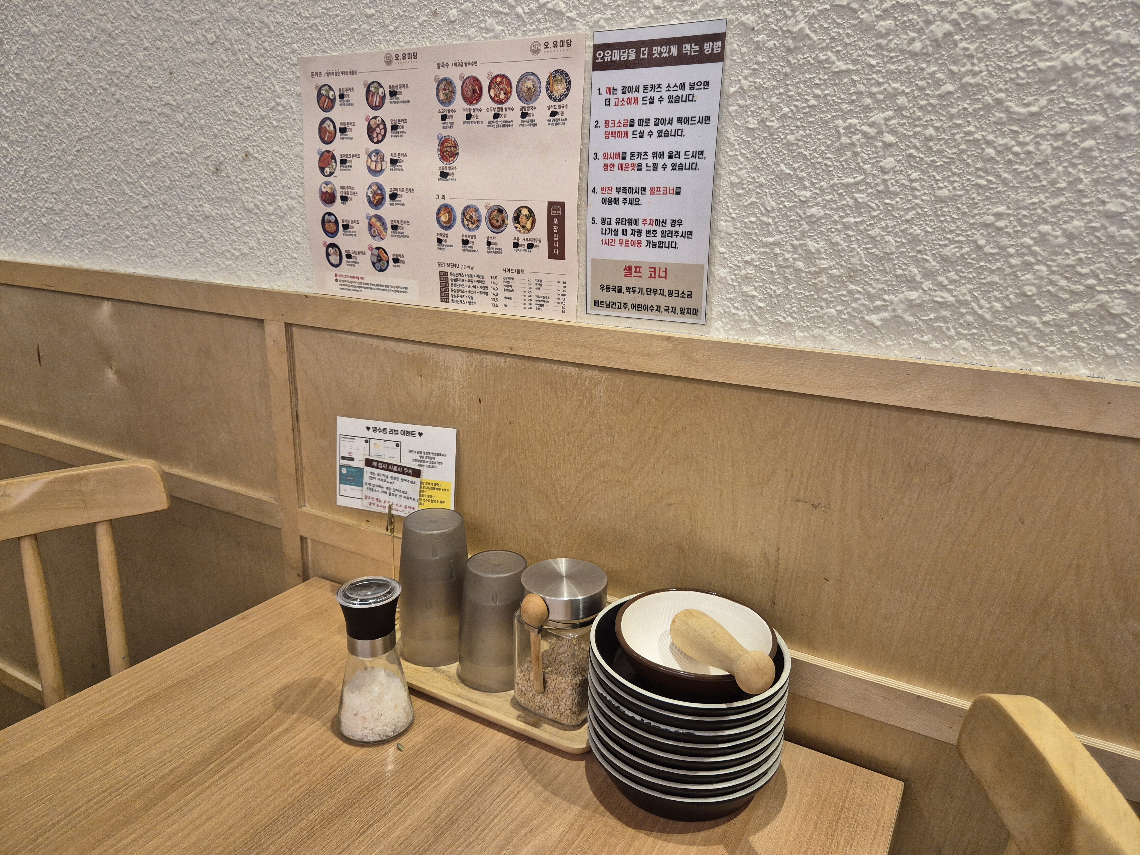 테이블에는 소금, 참깨, 그릇이 놓여있다!