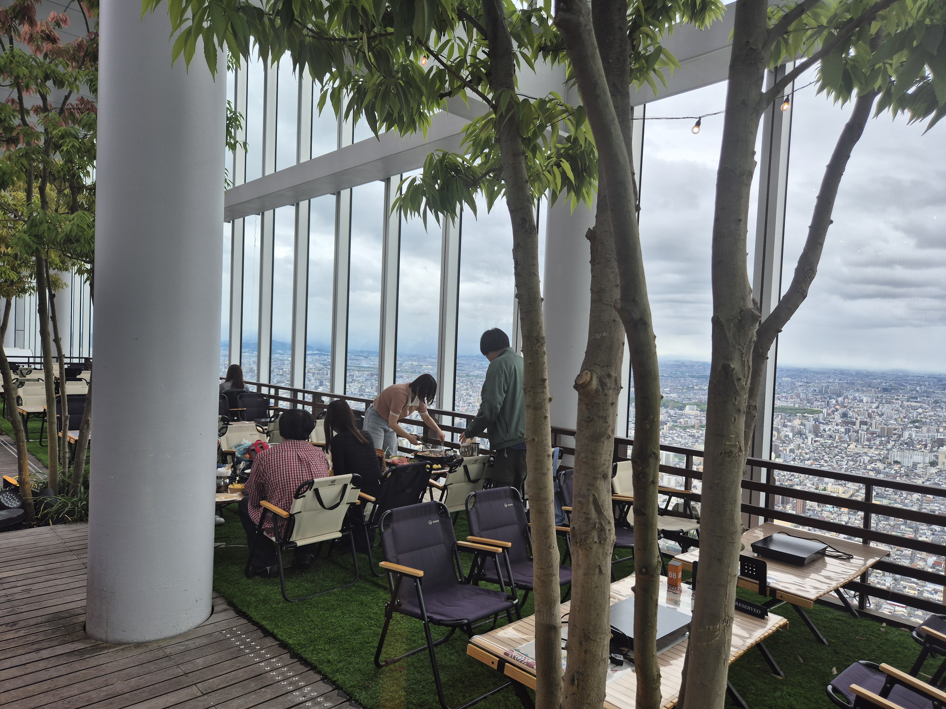 창가에 의자만 있는 곳도 있는데 테이블이 놓인 곳은 예약이 차 있었다! 어떤 테이블에서는 바비큐도 구워 먹을 수 있게 되어있다! 고기 냄새가 진동~