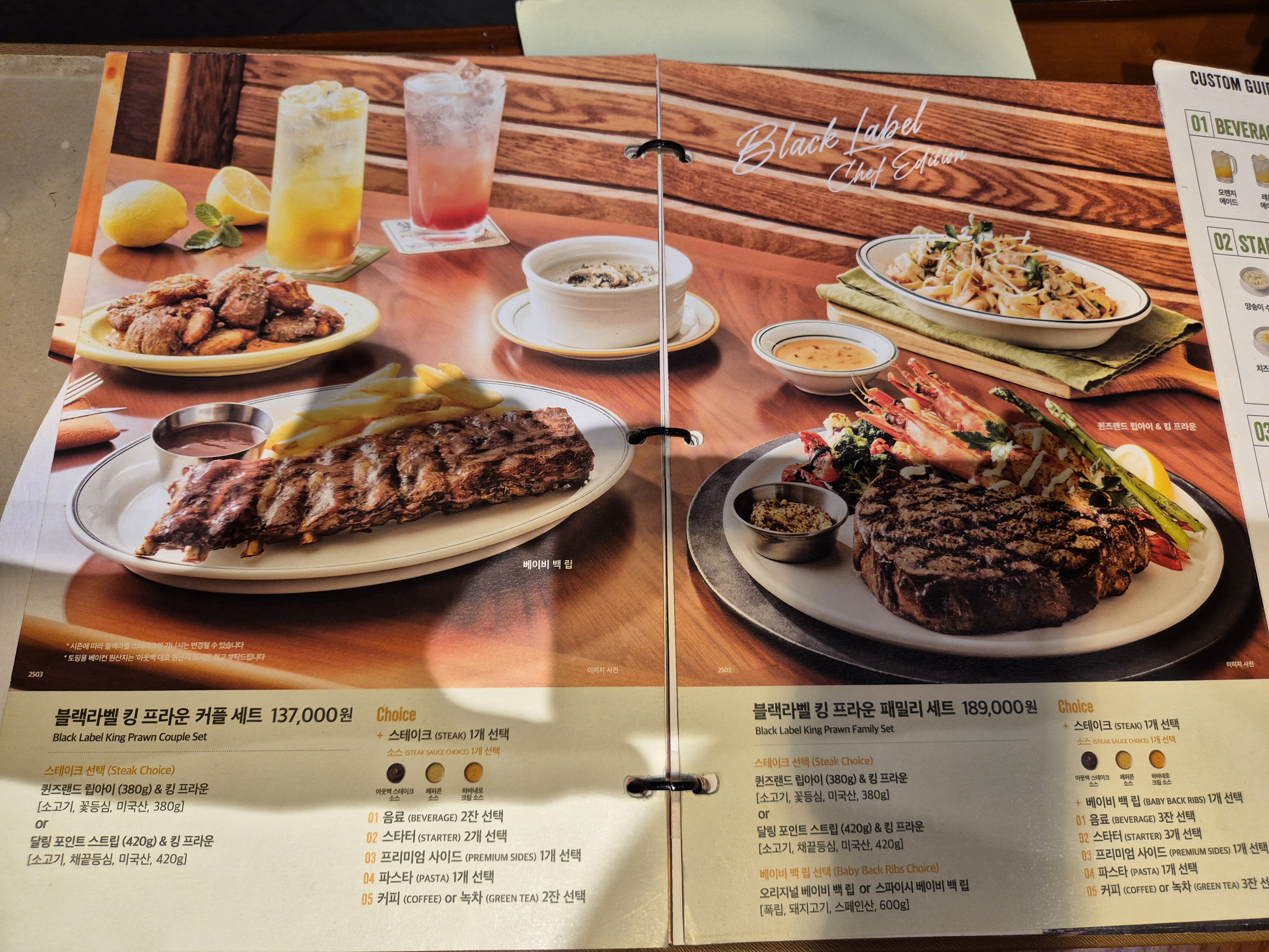 메뉴는 2명 세트로 미리 알아보고 온 거라 블랙라벨 킹 프라운 커플 세트로 주문하였다! 선택 가능한 메뉴들로 구성된 커플 세트이다!
