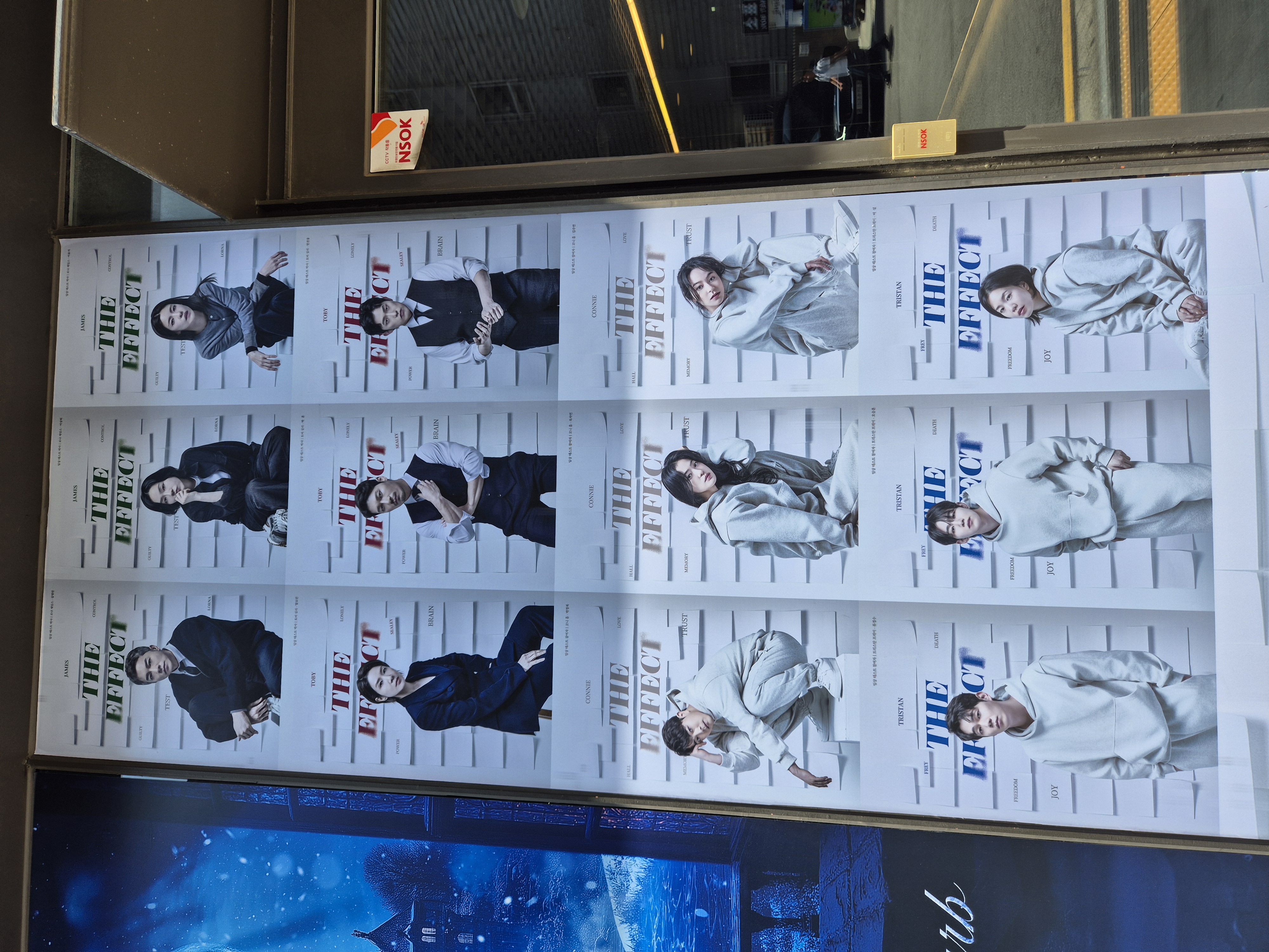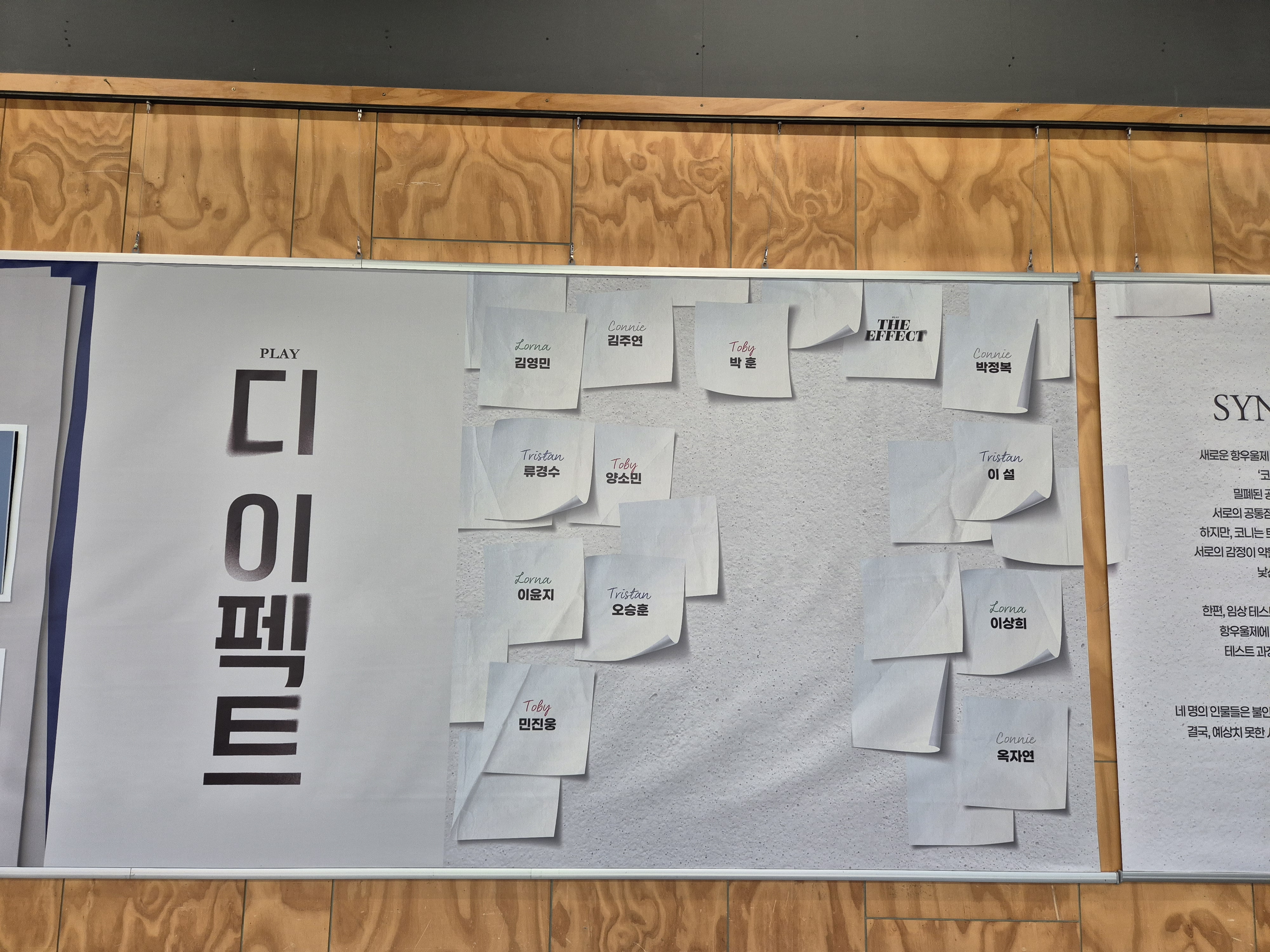 엘리베이터에서 내리면 오른쪽은 화장실, 왼쪽은 공연장 입구 방향이다~ 왼쪽에 디 이펙트 연극의 출연 배우들 이름이 표시되어 있다!