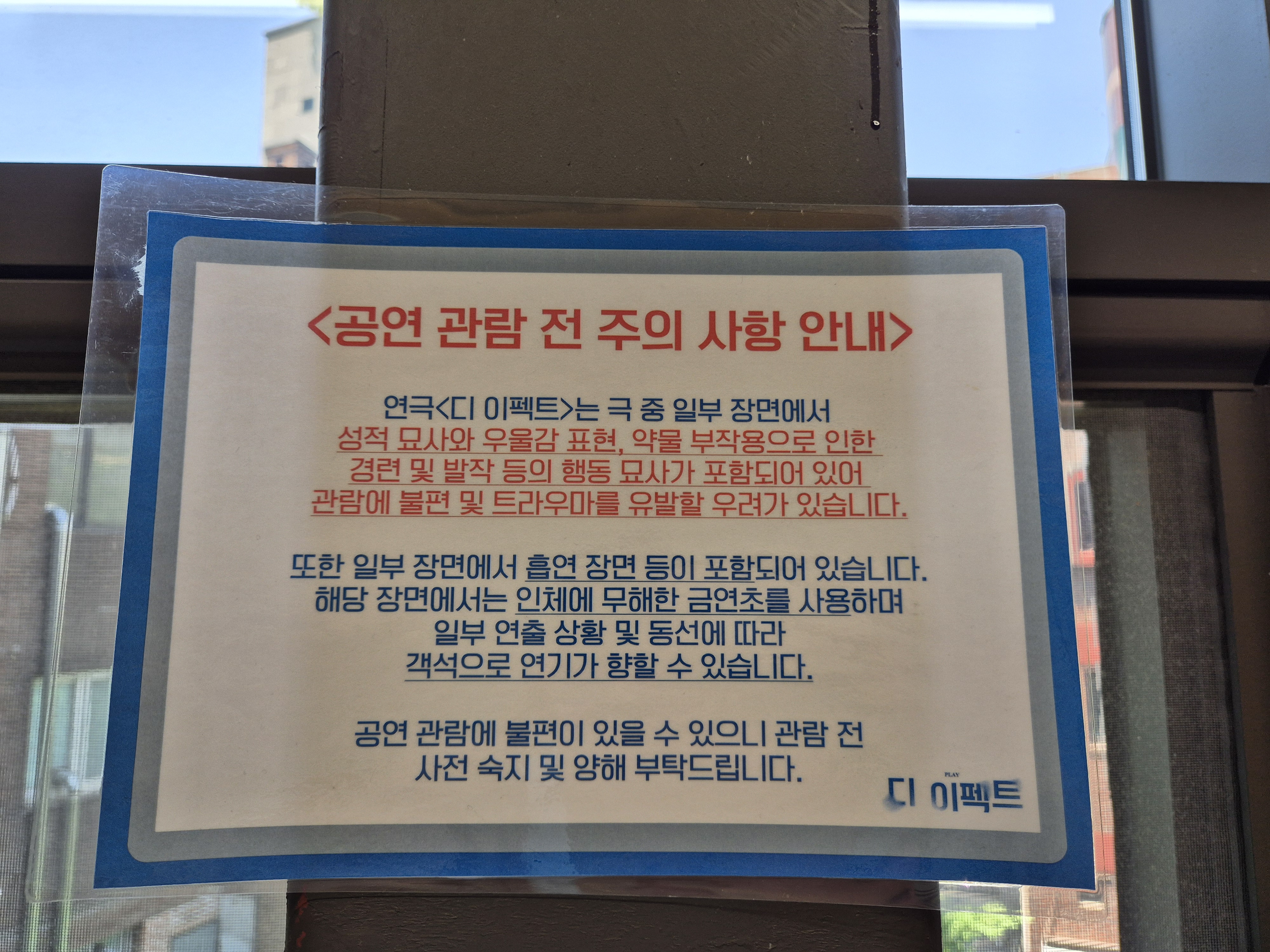 관람 주의 사항이 표시되어 있다! 극 중에 깜짝 놀랄 수 있는 부분이 있고 배우가 무해한 금연초를 피운다는 내용이다~