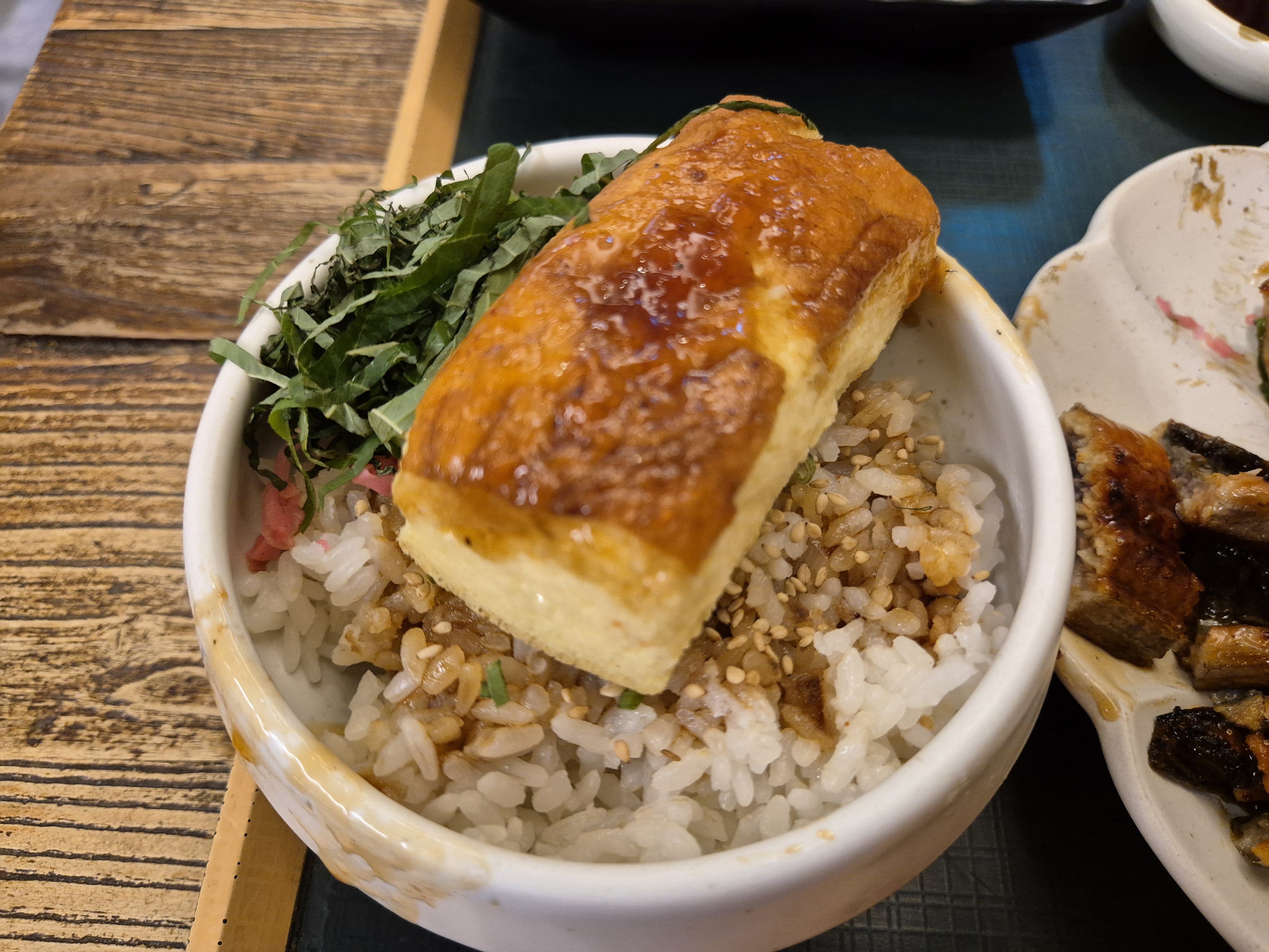내가 주문한 장어덮밥도 나왔다~ 반마리인데 크기가 어마어마하다! 머리와 꼬리를 자르라고 했던 것이 그릇에 삐져나오기 때문이었군..