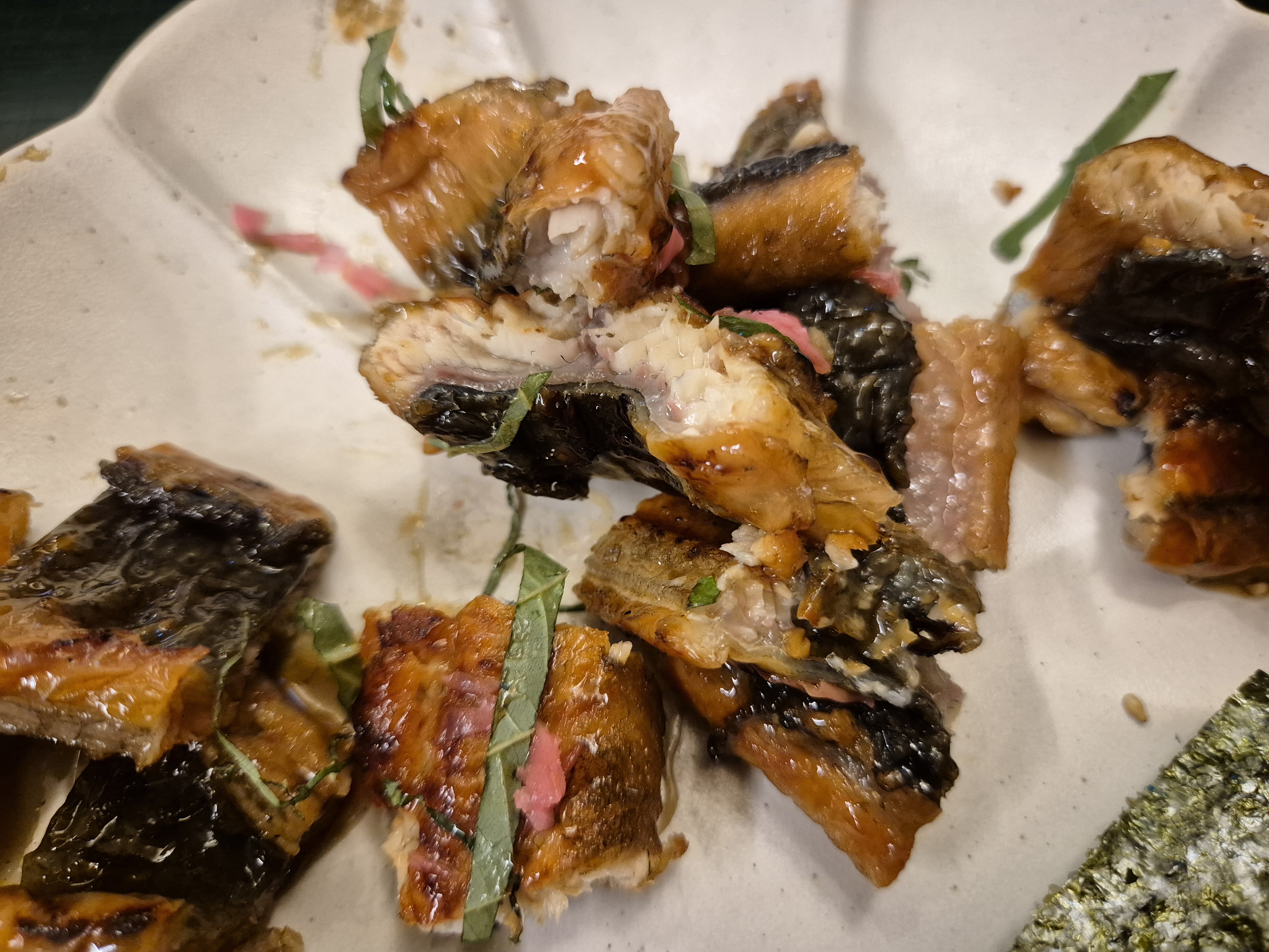 밥 위에 장어를 그릇에 옮기니 계란이 보인다~ 장어와 계란, 김을 같이 먹으면 굉장히 맛있다! 깻잎과 밥을 같이 먹으면 환상의 조화^^