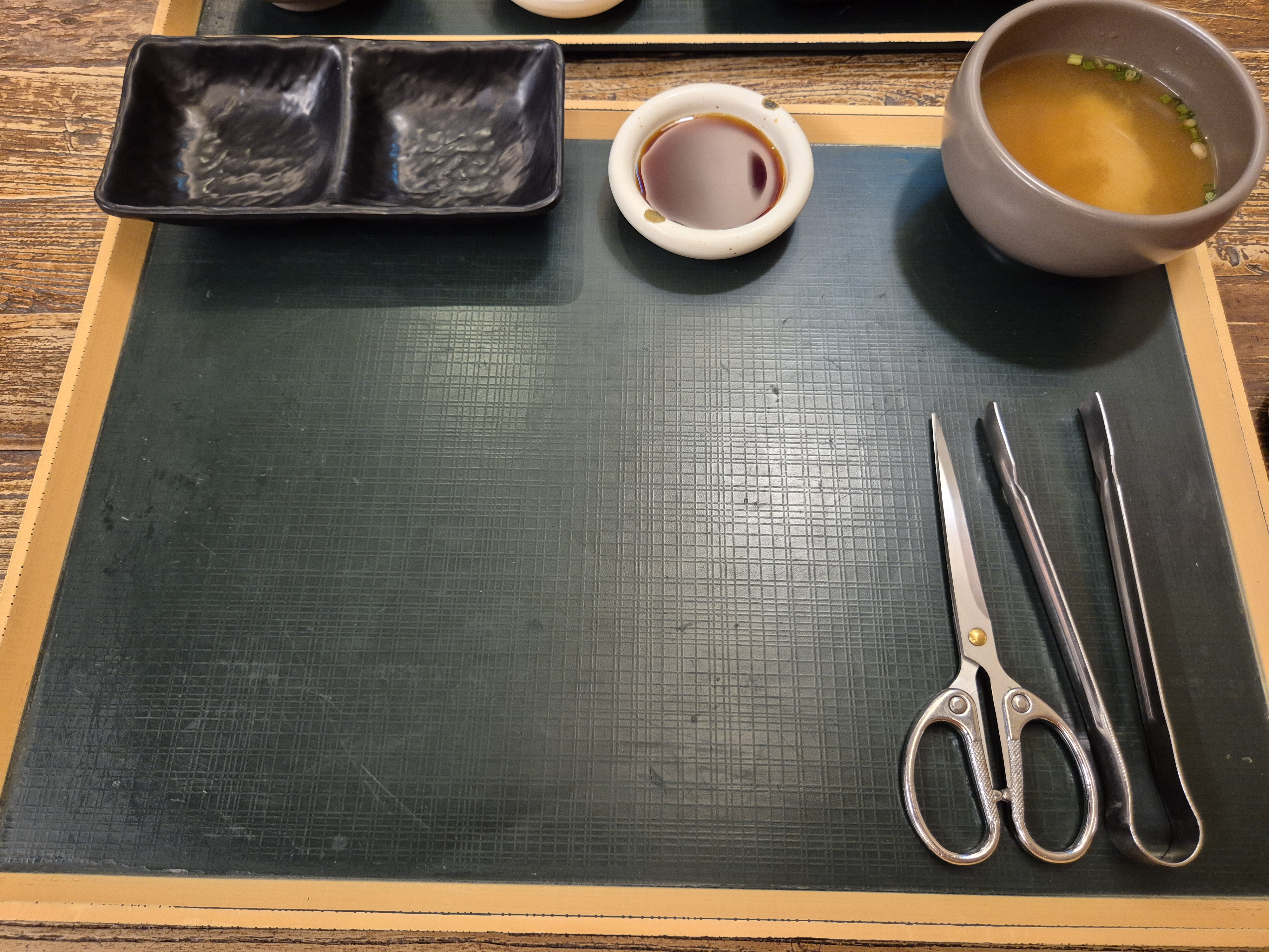 필자는 장어덮밥 반마리를 주문했는데 음식이 나오기 전에 기본 세팅이 나왔다! 장어를 자르기 위한 집게와 가위도 나오고 소스와 장국이 같이 나온다~
