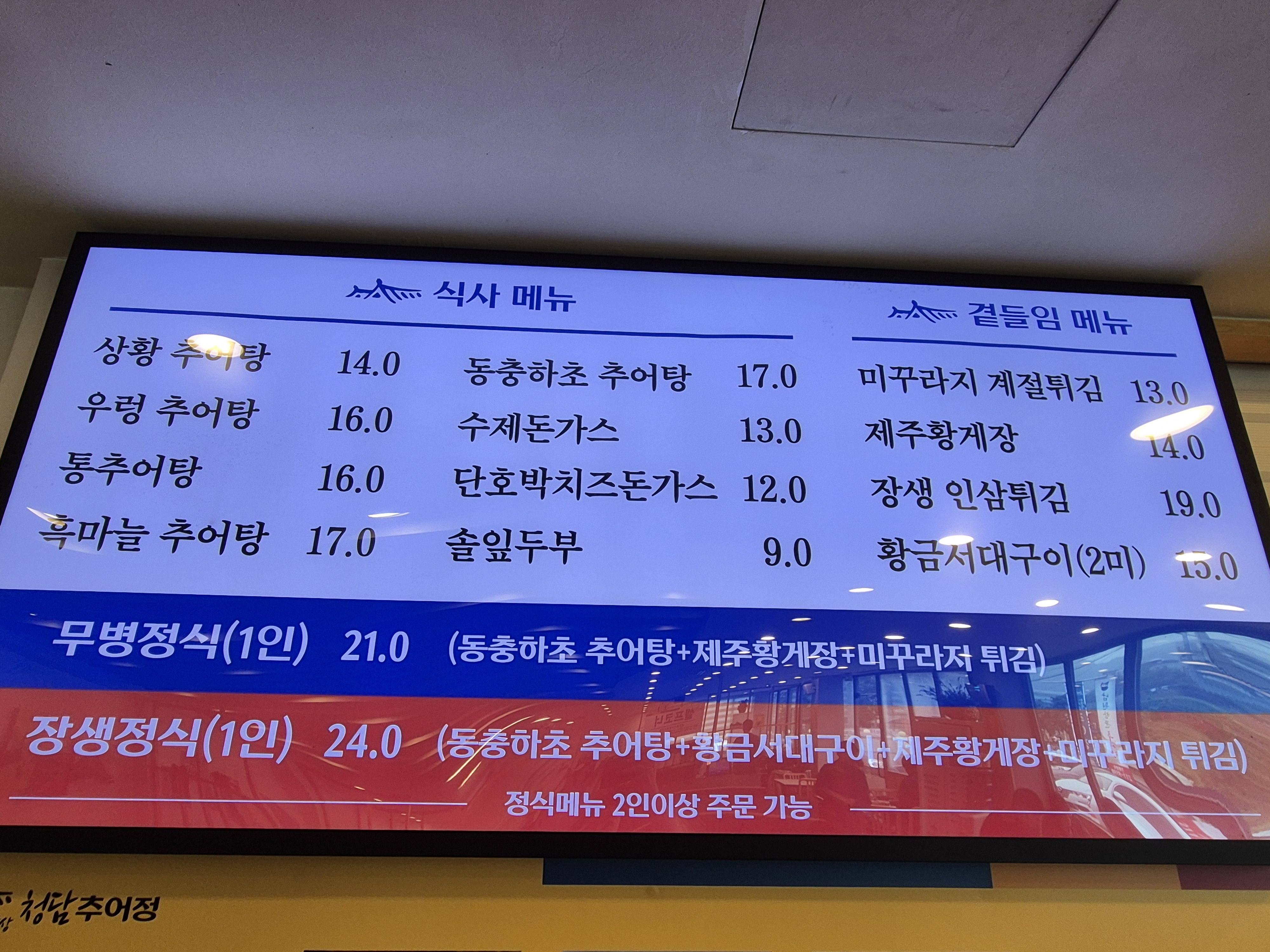 벽에 메뉴판이 걸려있는데 우렁 추어탕과 미꾸라지 튀김을 주문하였다~