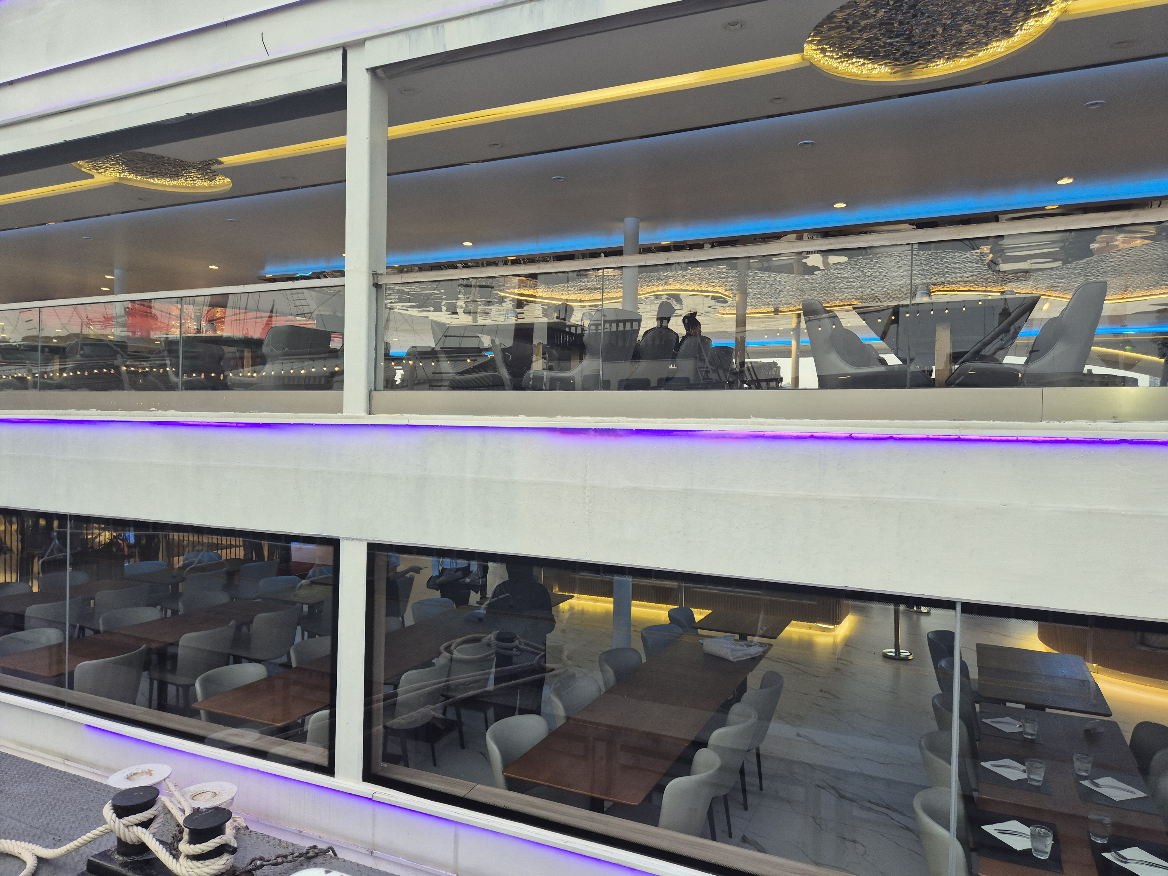 크루즈 옆을 지나 승선할 때 창 안으로 비친 테이블과 의자들은 굉장히 깔끔해 보였다~