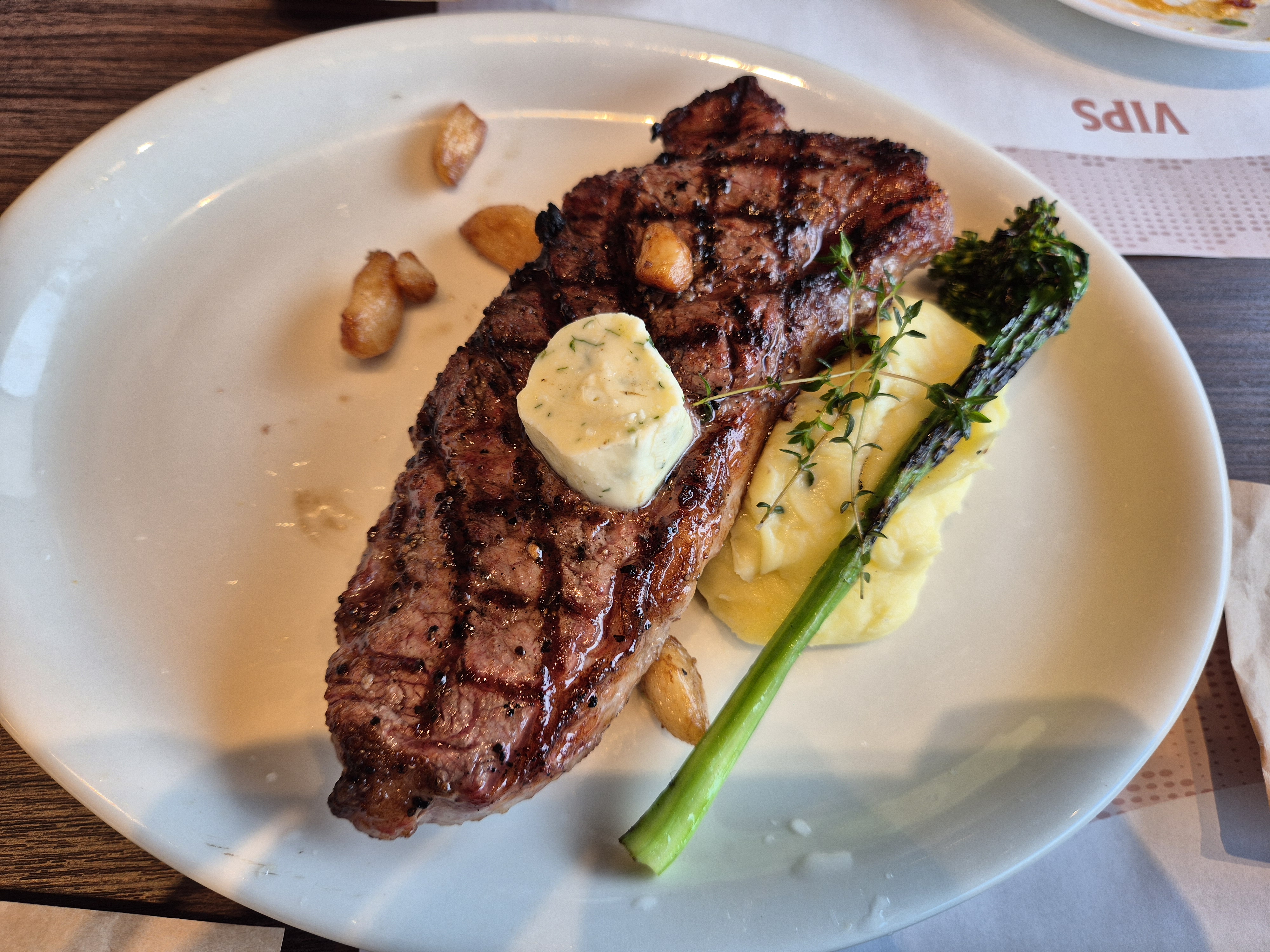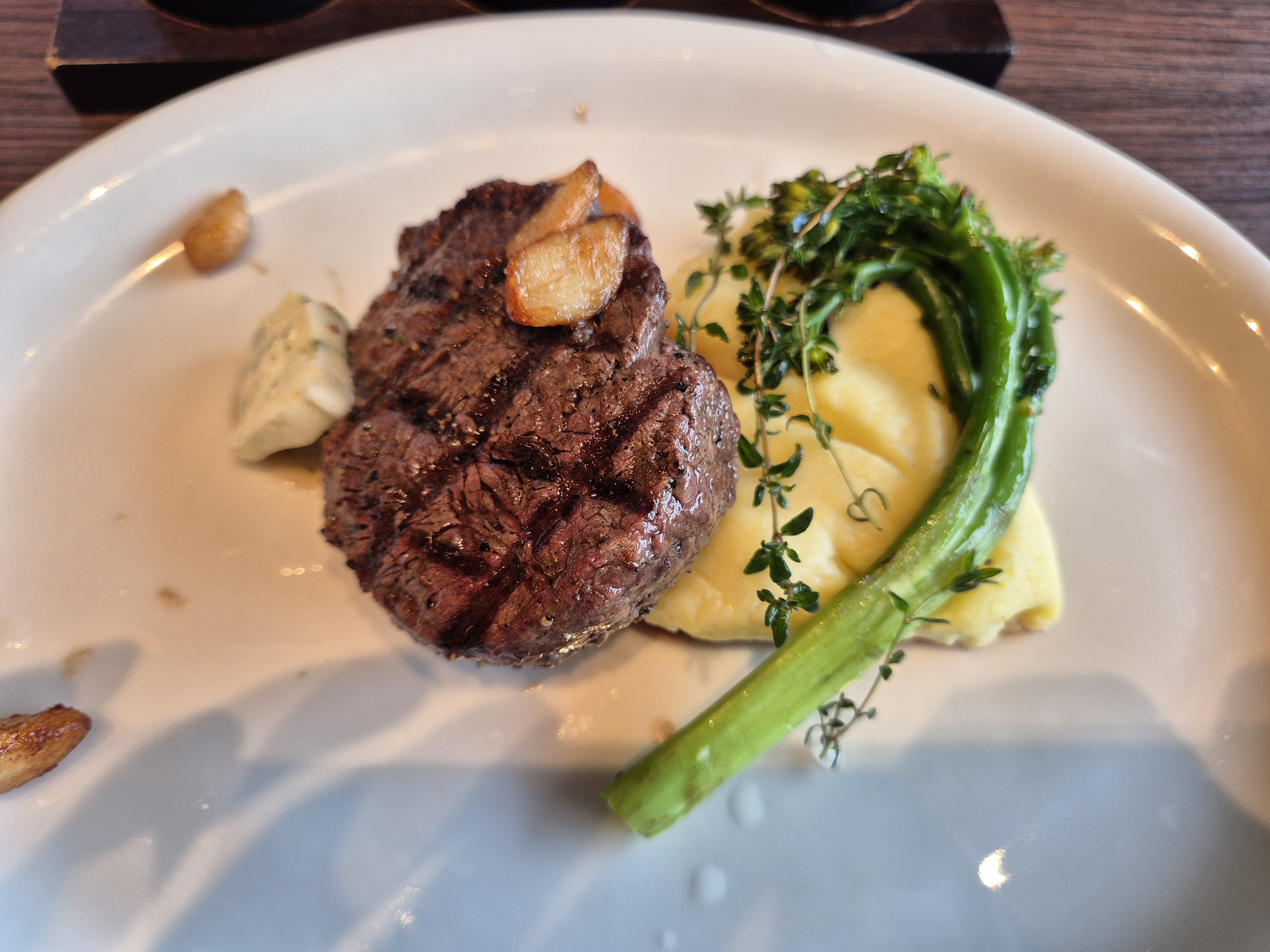 스테이크는 미디엄 레어로 먹었고 육즙이 살아있고 고기가 매우 부드럽고 맛있었다~ 포크와 나이프로 적당한 크기로 잘라먹었다!
