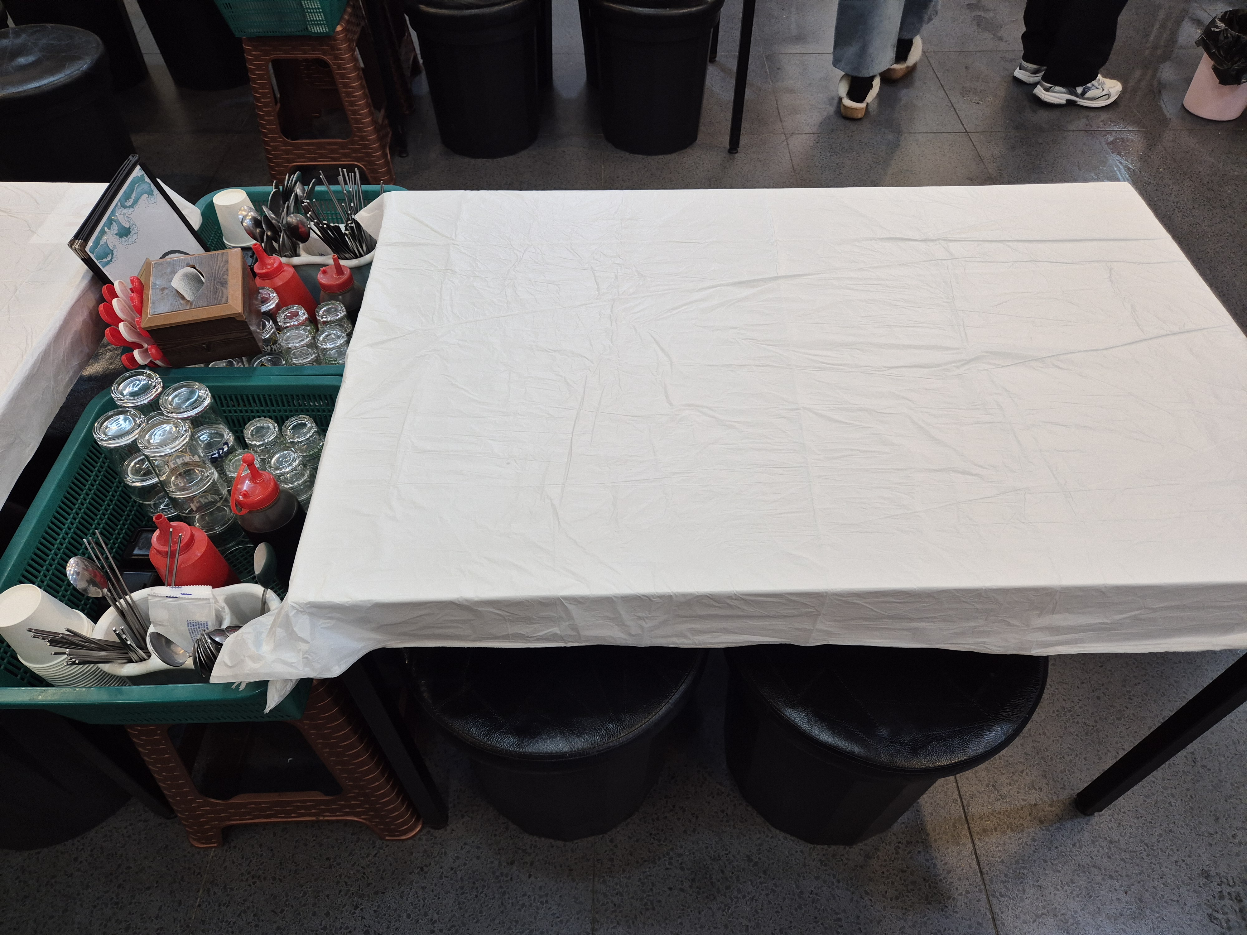 테이블 옆에 술잔, 소스 그릇, 간장 등 많은 것들이 바구니 안에 담겨 있다!