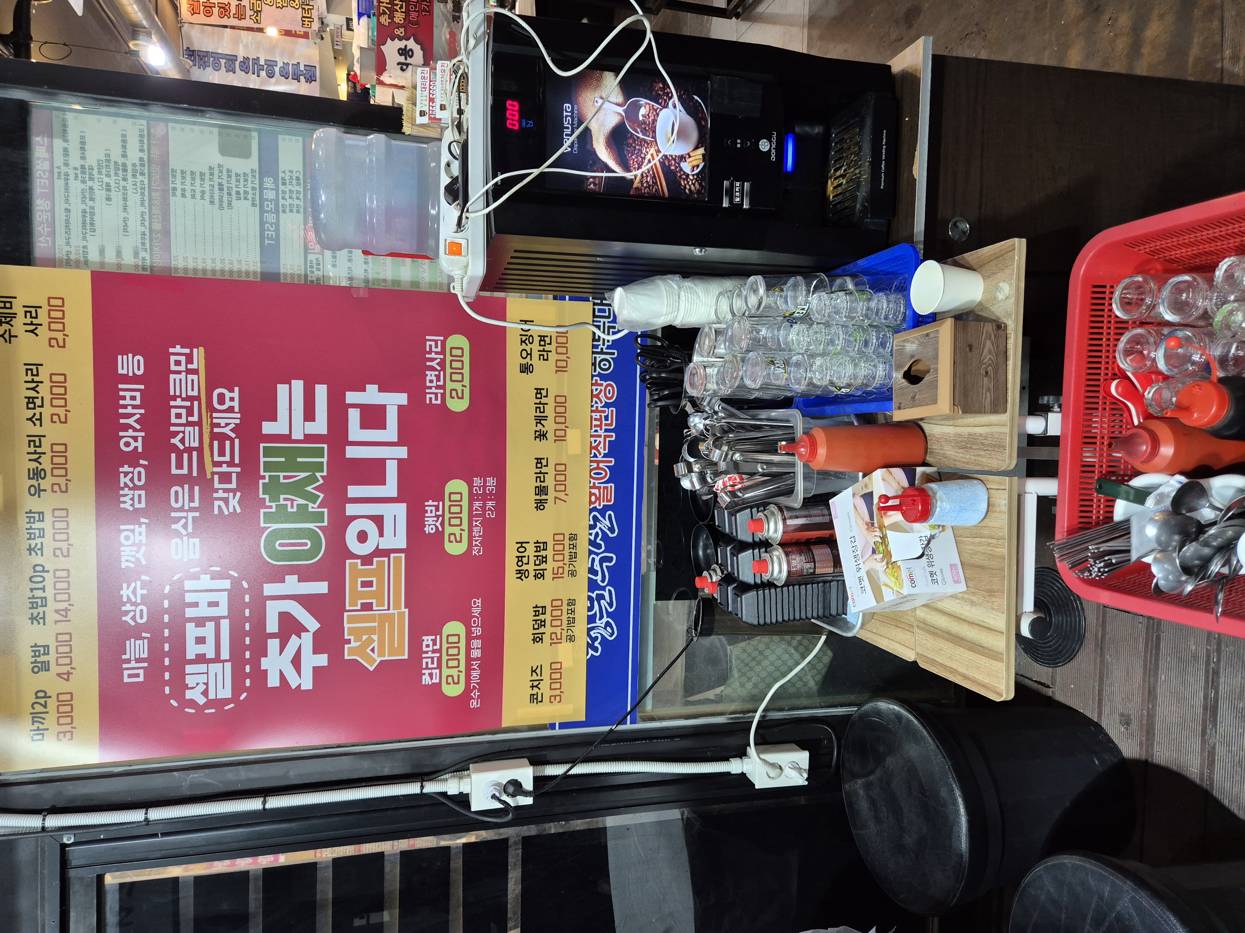 셀프바가 준비되어 있고 채소와 쌈장, 고추냉이는 무료로 먹을 수 있다고 한다! 컵라면, 햇반, 사리는 유료이다~