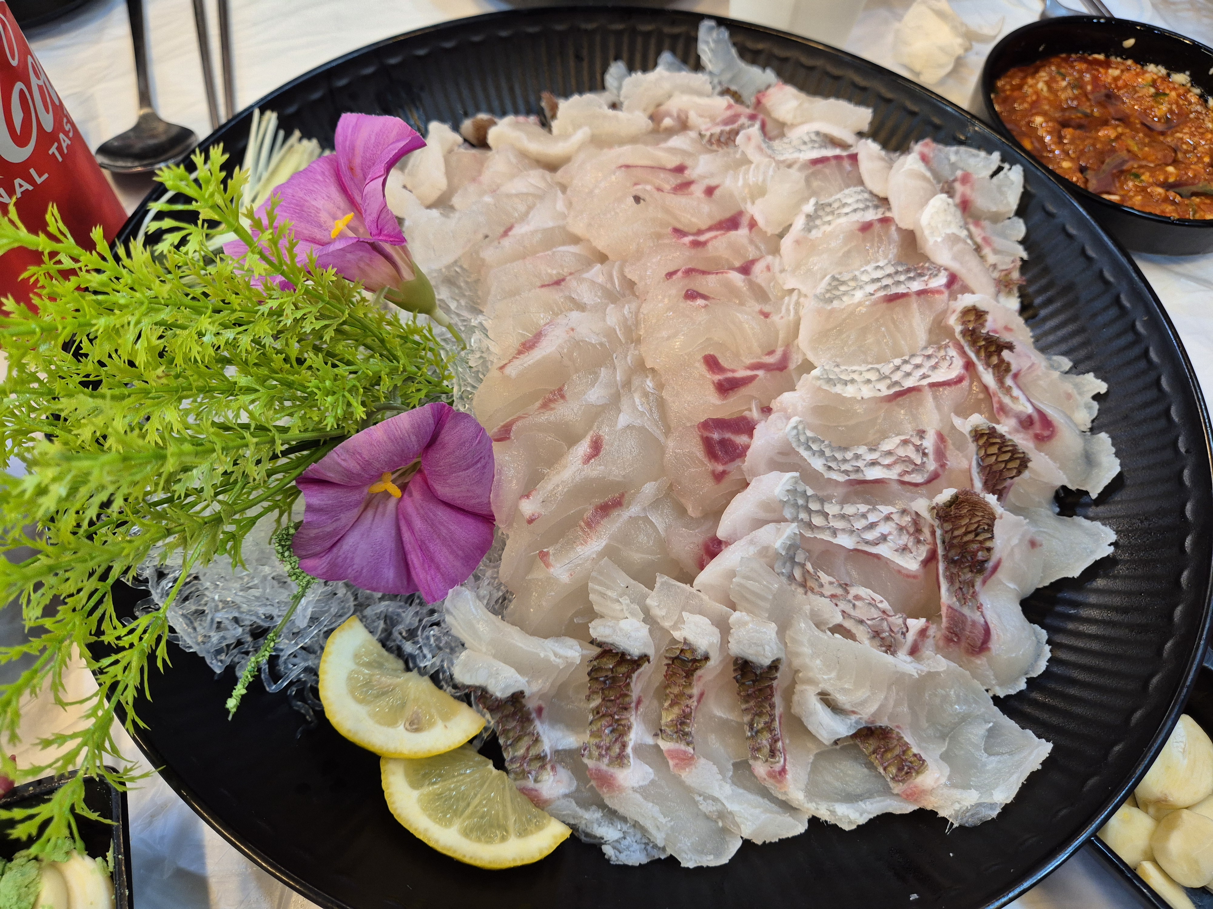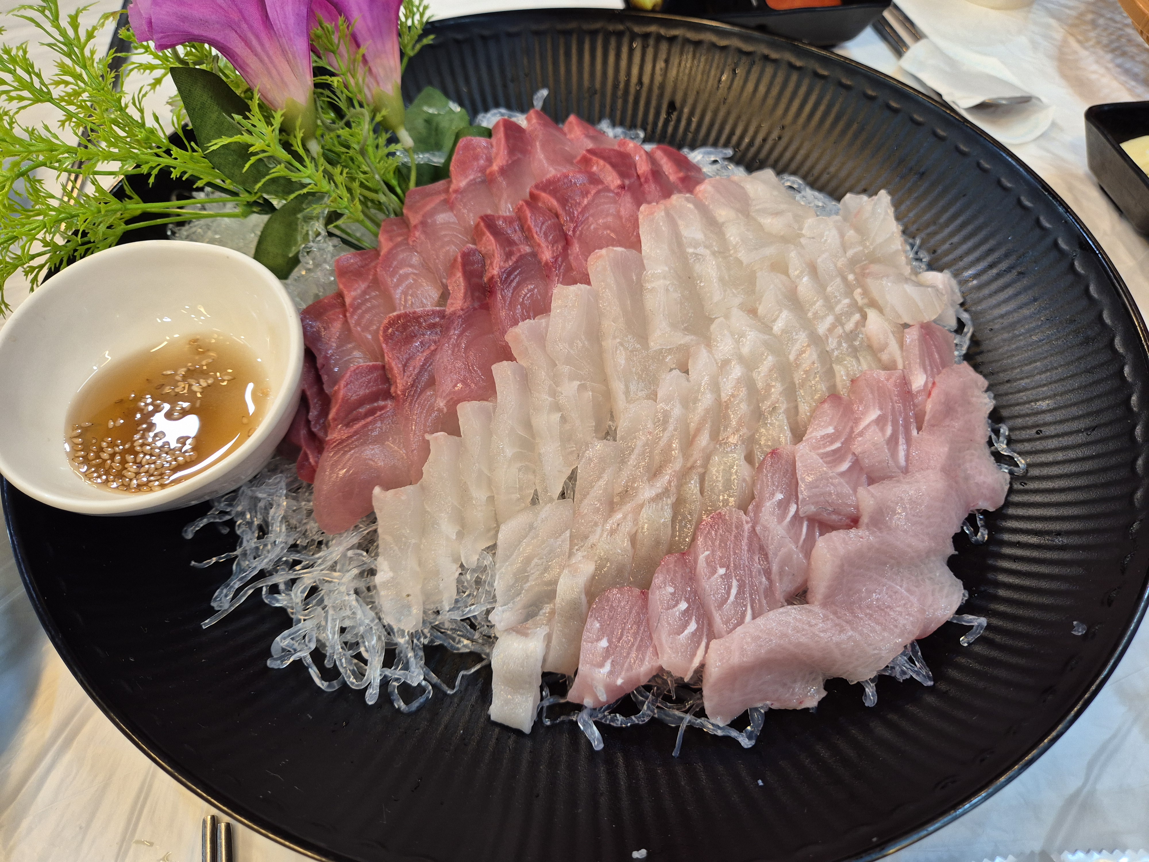 주문한 대방어와 광어! 대 사이즈로 2개 시켜 1 접시에 반씩 나눠 담았다~ 두 가지 회 모두 싱싱하고 맛도 깔끔하여 무난하게 먹기 좋았다!