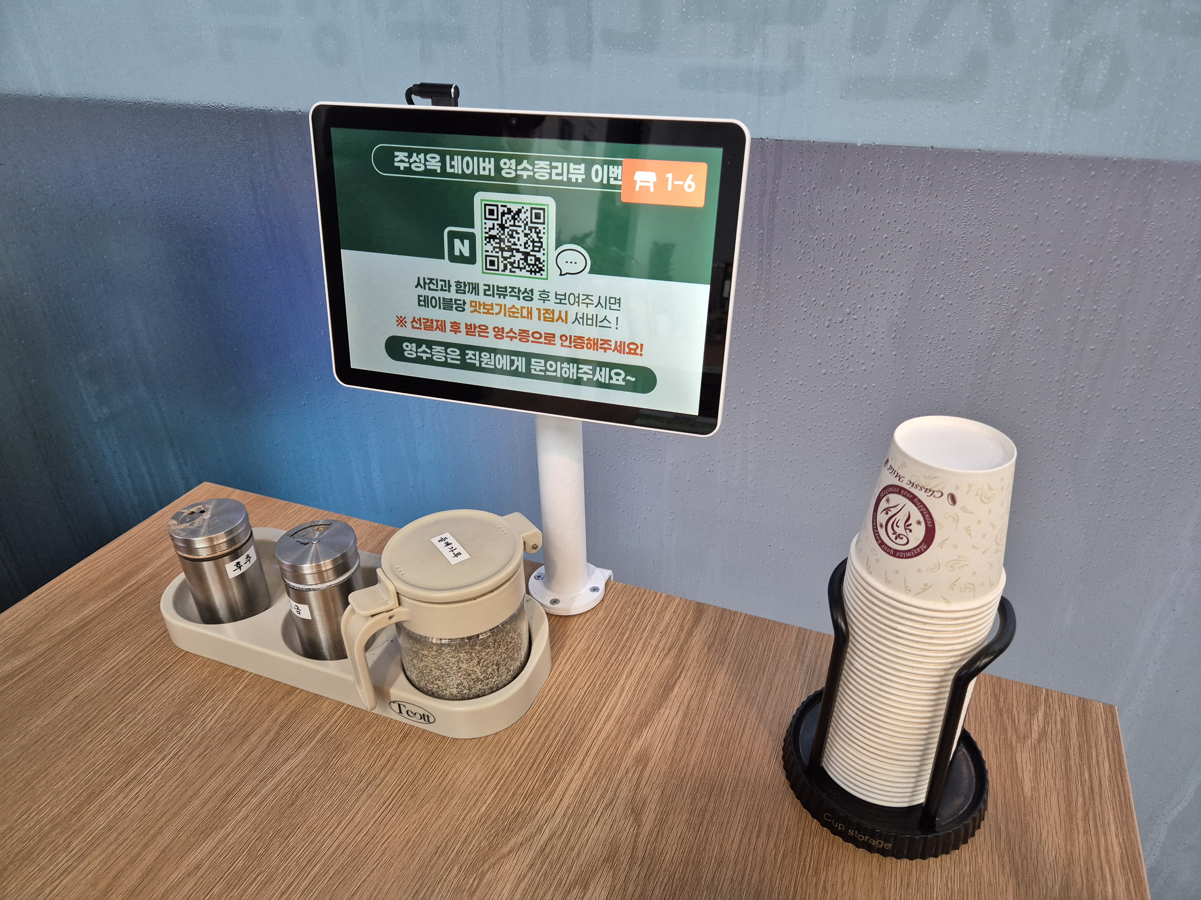 테이블은 종이컵, 태블릿 pc, 후추, 들깨 통으로 구비되어 있다! 계산은 태블릿 pc로 주문하고 계산은 식사를 마친 후 진행하면 된다!