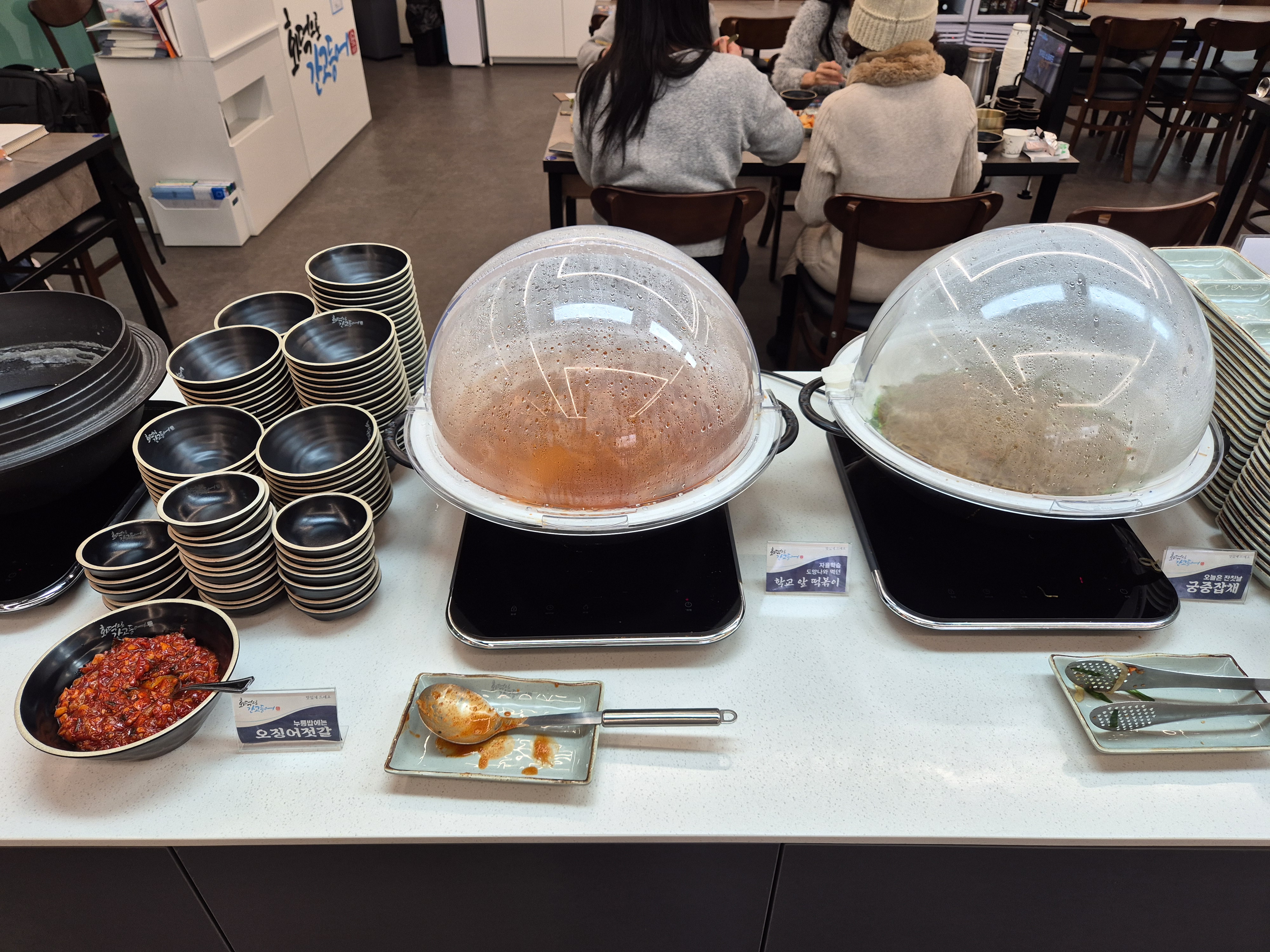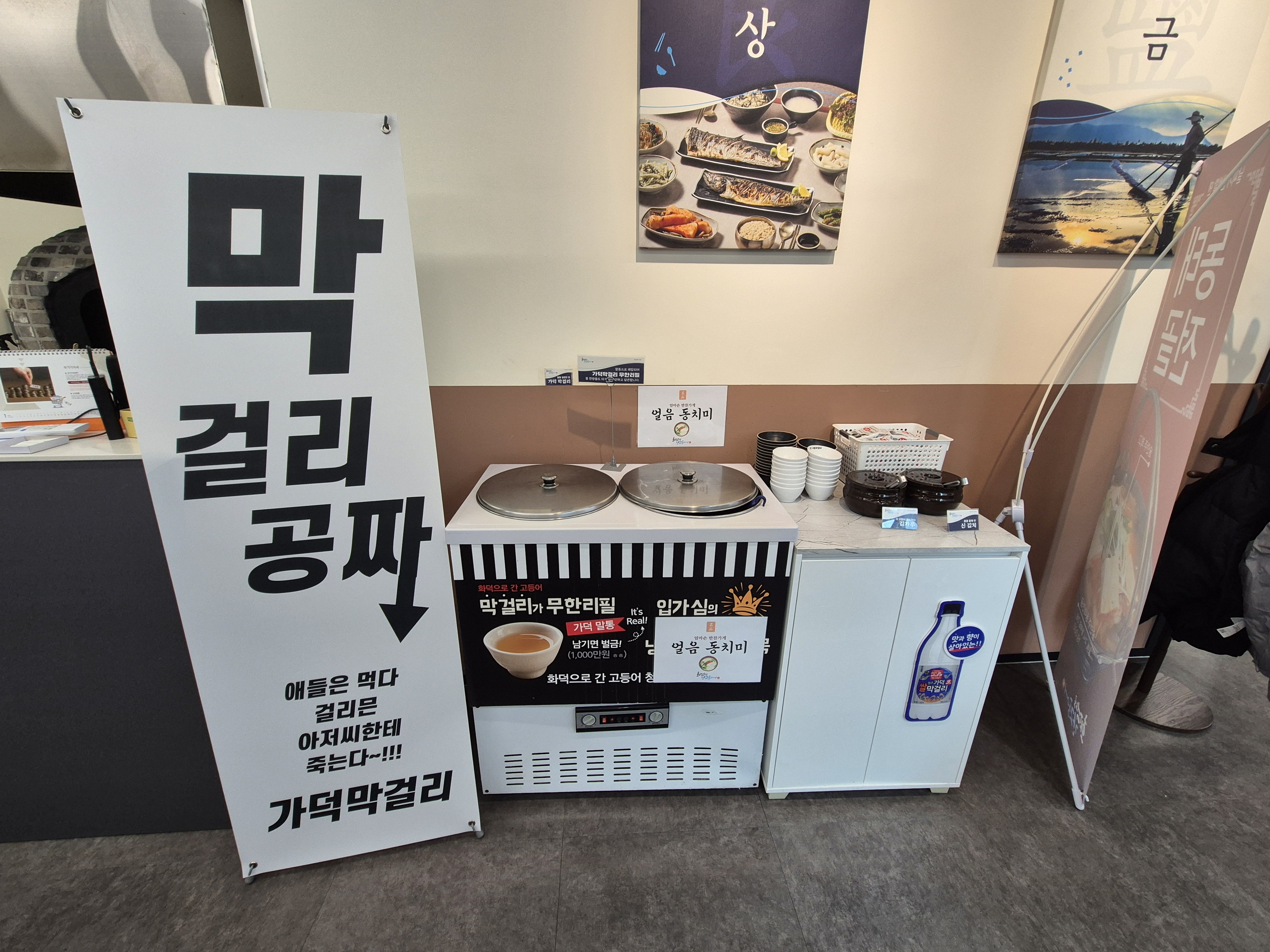 끝인 줄 알았던 셀프 코너가 또 보여 확인해 보았음! 김가루, 신 김치, 맛김, 동치미 거기에 막걸리까지 무료였다~ 두 눈을 의심하여 비벼보았으나 맞았음!