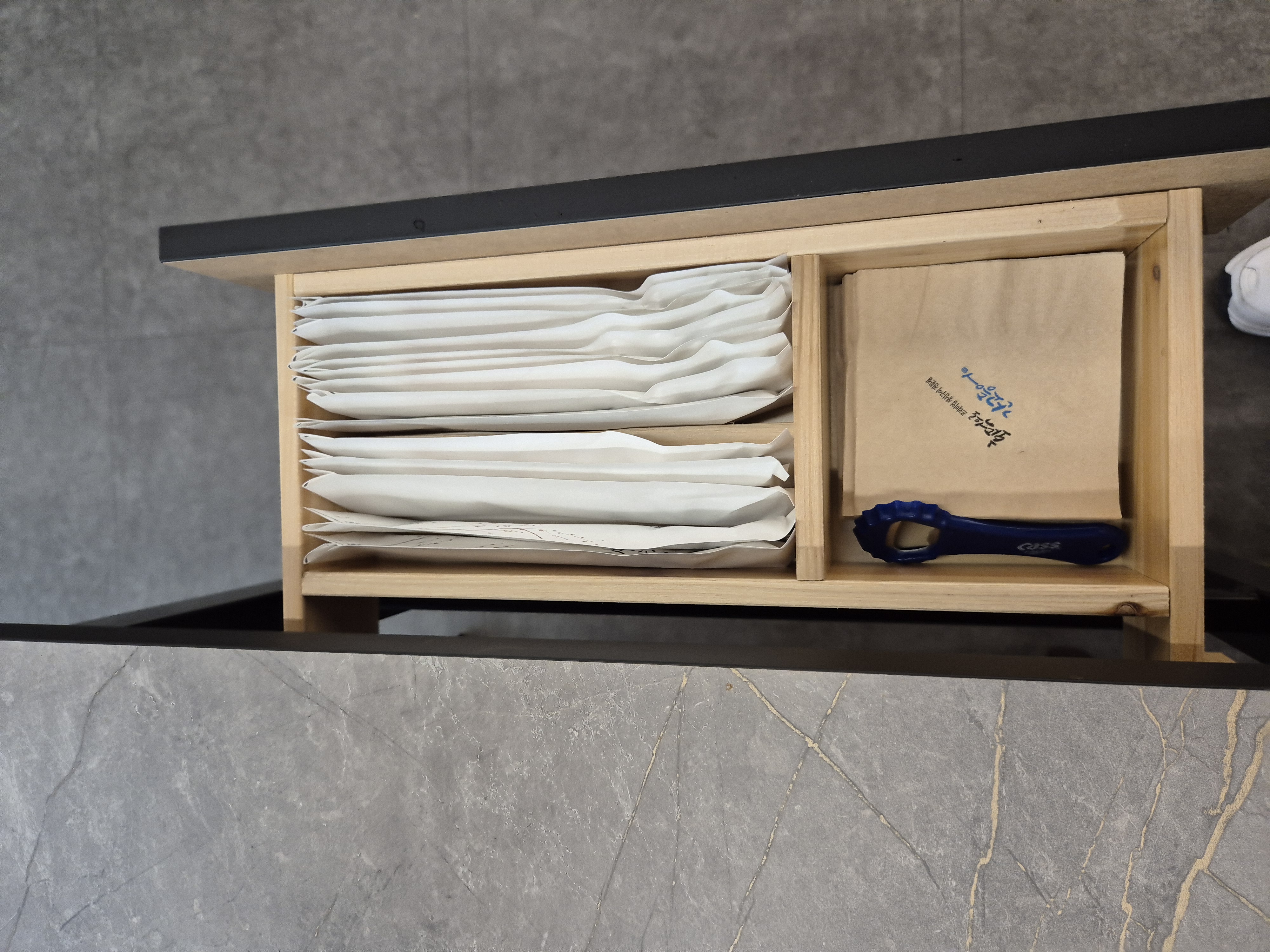 테이블 옆의 공간에 수저 세트와 휴지가 비치되어 있다!