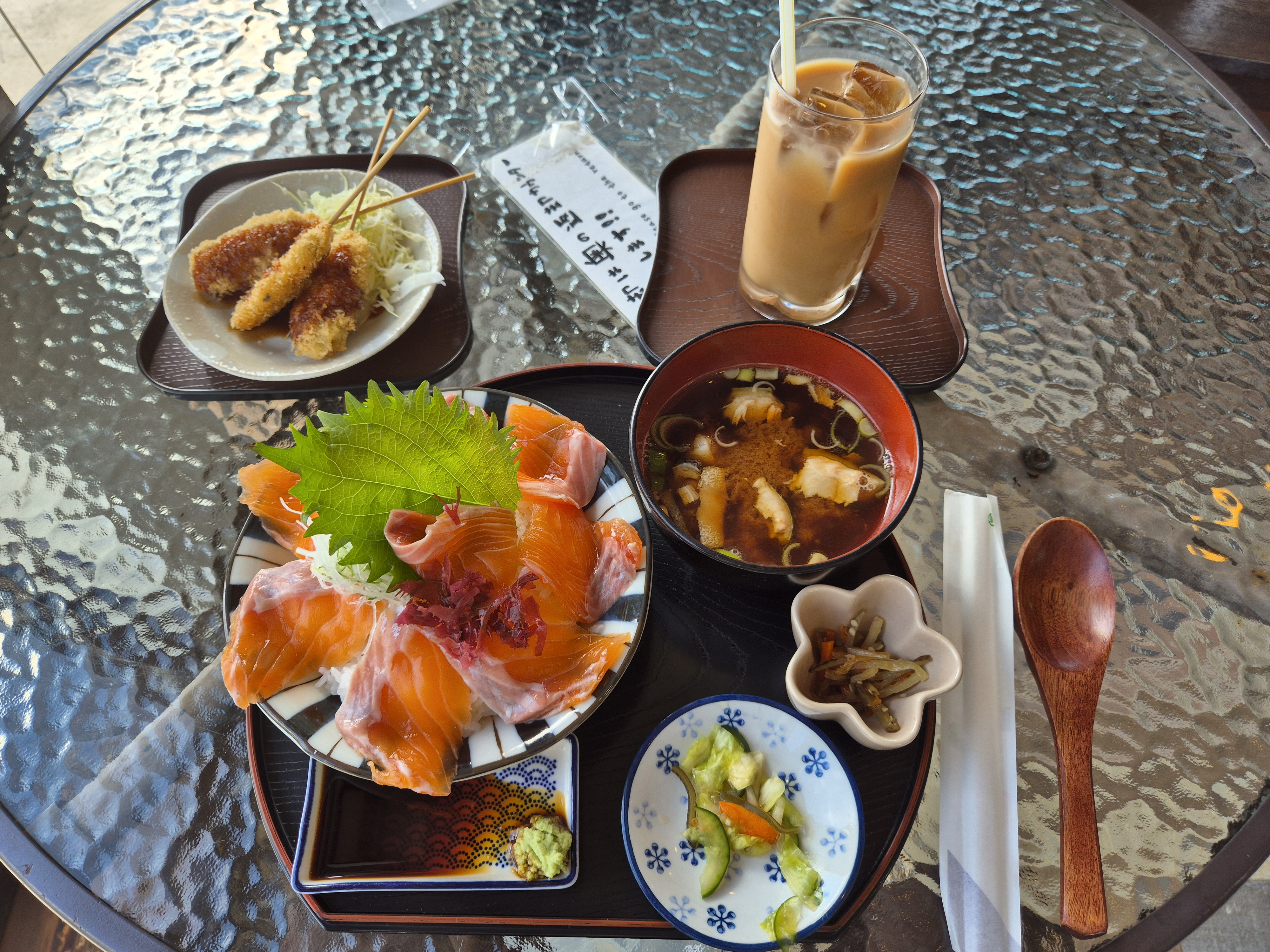 정상에서 음식점은 한정적이라서 마을에서 먹을까 고민하다가 정상에서 먹었다! 수량 제한 연어밥과 꼬치였는데 맛있게 잘 먹었다~