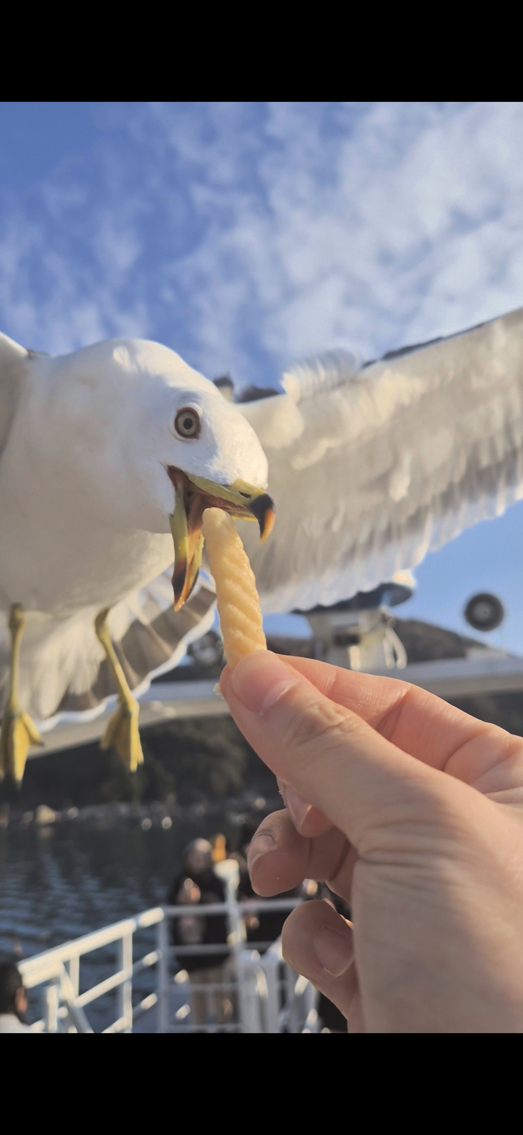 갈매기뿐만 아니라 독수리도 새우깡을 받아먹는다! 손으로 들고 있으면 채간다~ 근데 독수리는 부리와 발톱이 상대적으로 많이 날카로워서 조심성이 필요하다! 갈매기도 주고 내 입에도 넣고~ 2 봉지는 순식간에 끝나버렸다ㅋㅋ
