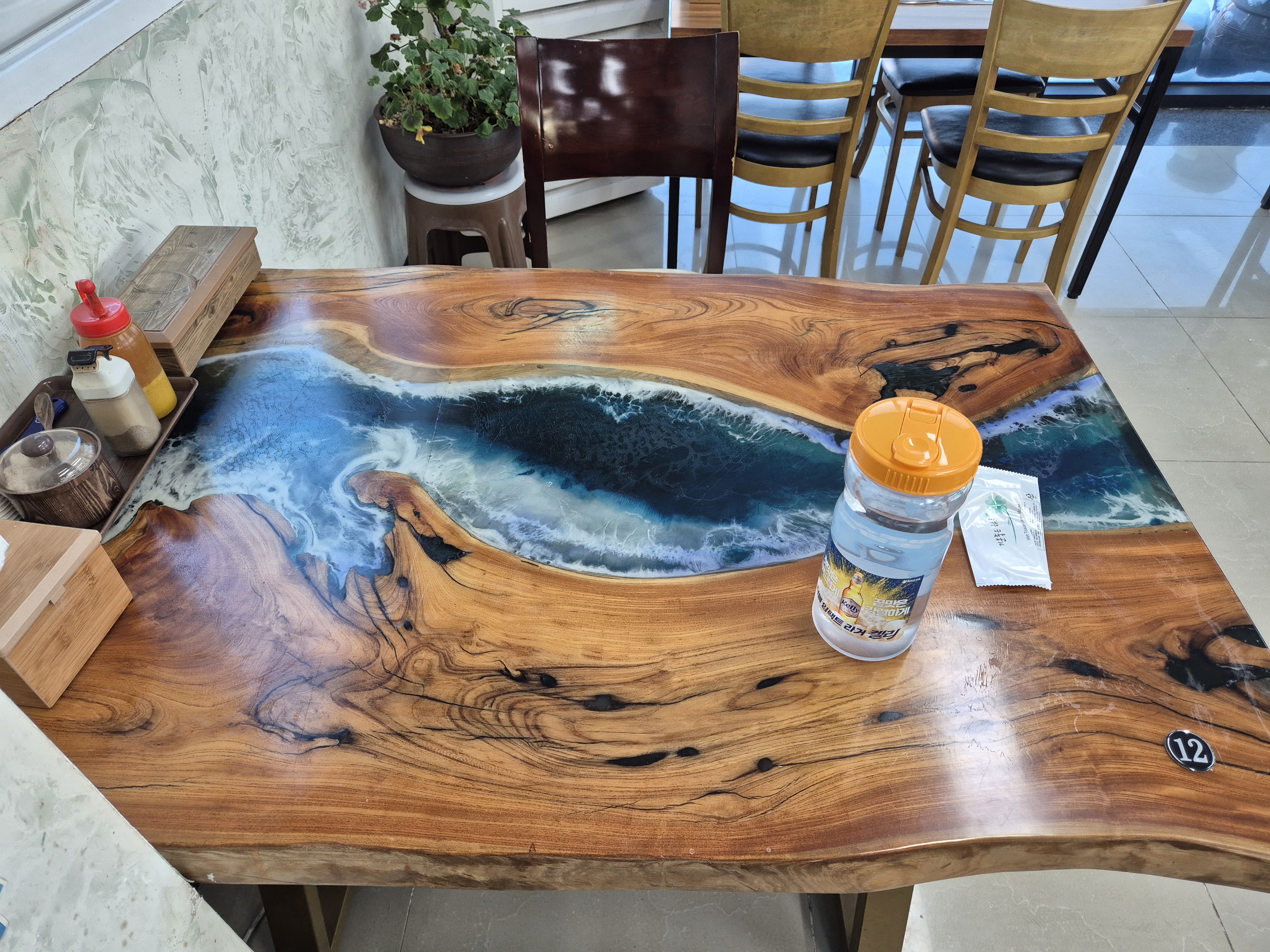 테이블에는 겨자소스, 소금, 휴지, 수저들로만 구성되어 있다!