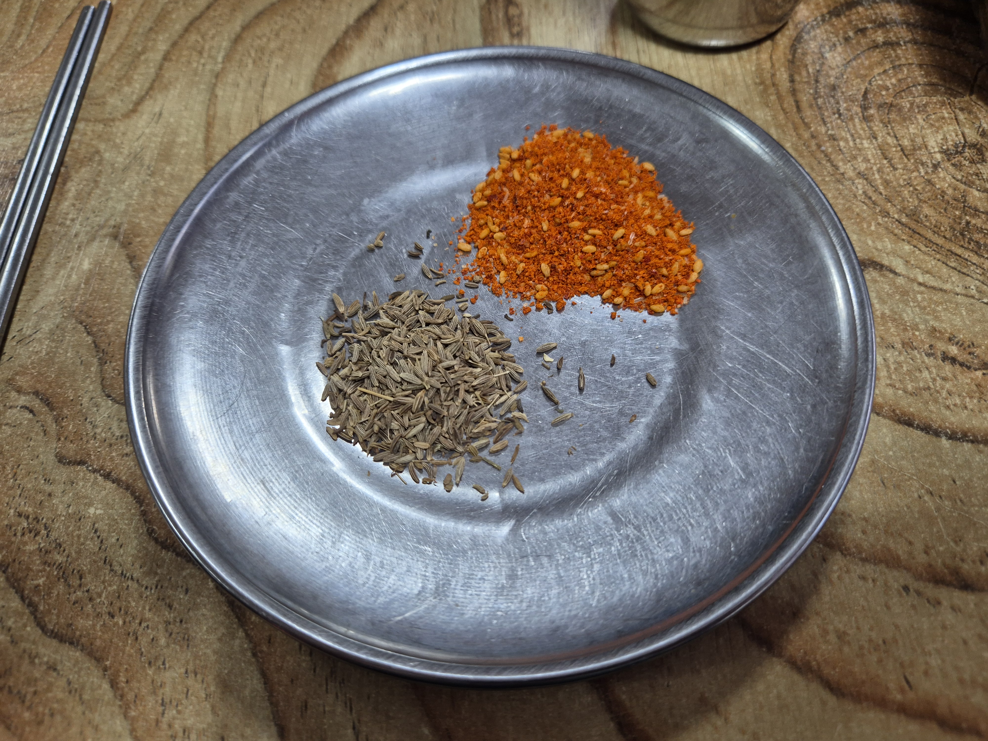 이름은 잘 모른 지만 양꼬치가 나오기 전에 향신료를 세팅하였다! 향신료는 식사에 안 맞는 사람들도 많으니 일단 조금 먹어보는 것을 추천한다~